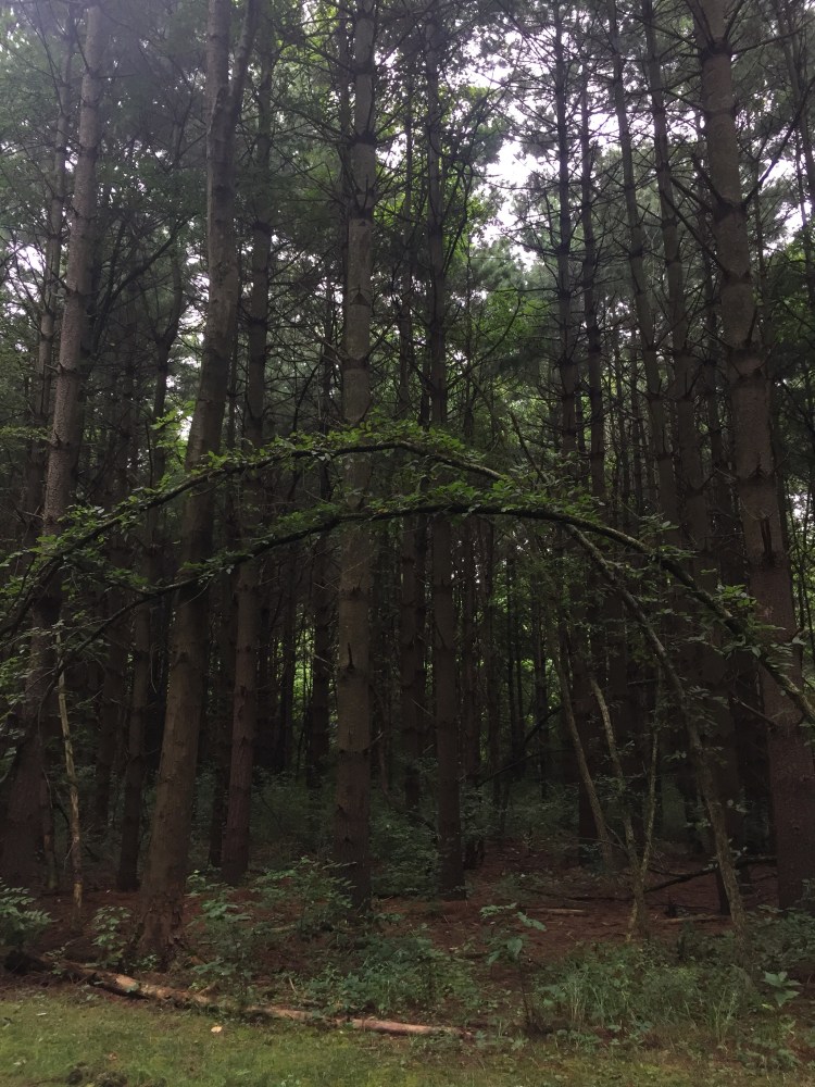 Some interesting and pretty trees leaning to make an arch.