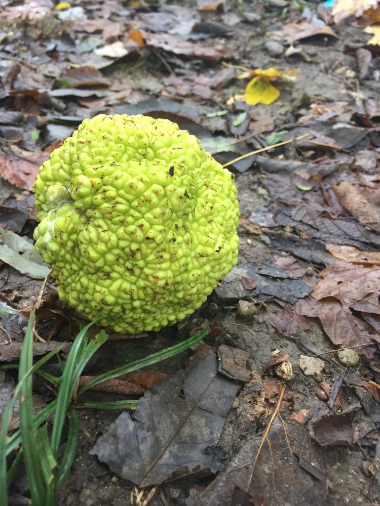 I saw this strange plant along the trail and had no idea what it was. I thought it was a fungus. Someone was able to identify the plant from my picture on Instagram as an Osage Orange. They are a fruits that grow on trees and apparently keep away spiders.