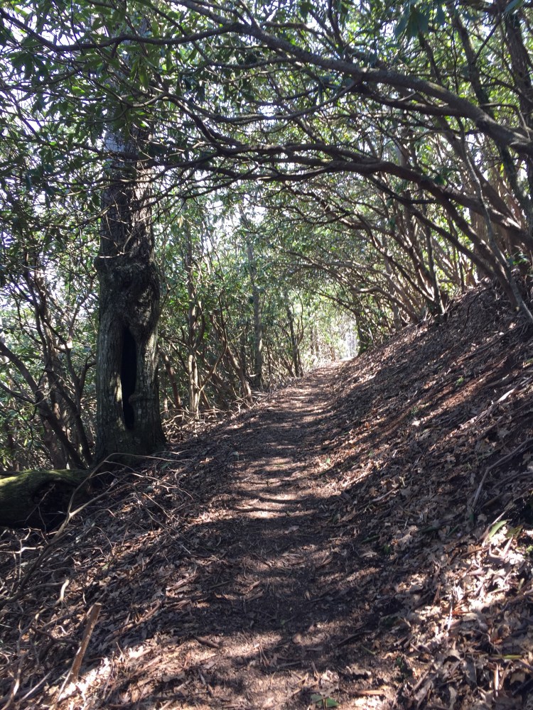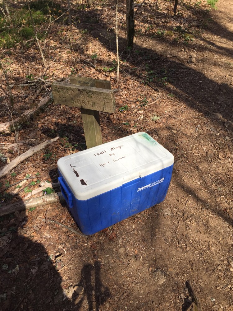 After lunch the elevation change was gentle. There were several parts where the forrest looked like a giant green meadow. The AT is also known as the green tunnel because of the rhododendron tunnels that hikers go through in most of the south. Today the green tunnel was very apparent. As I hiked the mountain before Deep Gap the terrain turned very rocky. I find rocks to be the hardest thing to hike on. At Deep Gap I revived so much trail magic. First I ran into a cooler that had a bunch of random food in it. I took a ziploc bag full of seaweed and a tiny packet of jam. I have a feeling the couple that gave me a candy bar earlier are the same ones that left the cooler. I was shocked about how far the couple was hiking for the day when I realized where they had to have parked their car. When I arrived at the Gap I took a long break to eat the seaweed and take off my shoes. I offered Chill Bill some as he walked by so he sat down to talk to me. He had a bunch of leaves hanging out the side of his pack and I asked what they were. He told me they were Ramps and gave me one to eat. It tasted like an onion and I wanted more. His wife Fern who is also thru hiking with him is a herbalist so she can identify a lot of plants and they eat many things they find along the trail. Another bit of trail magic I received was from Chuck and his son in the form of a Gatorade and trail mix. They were section hikers who were getting picked up from Deep Gap so they gave away their left over food to us thru hikers. I ate so much at the gap I counted it as dinner.