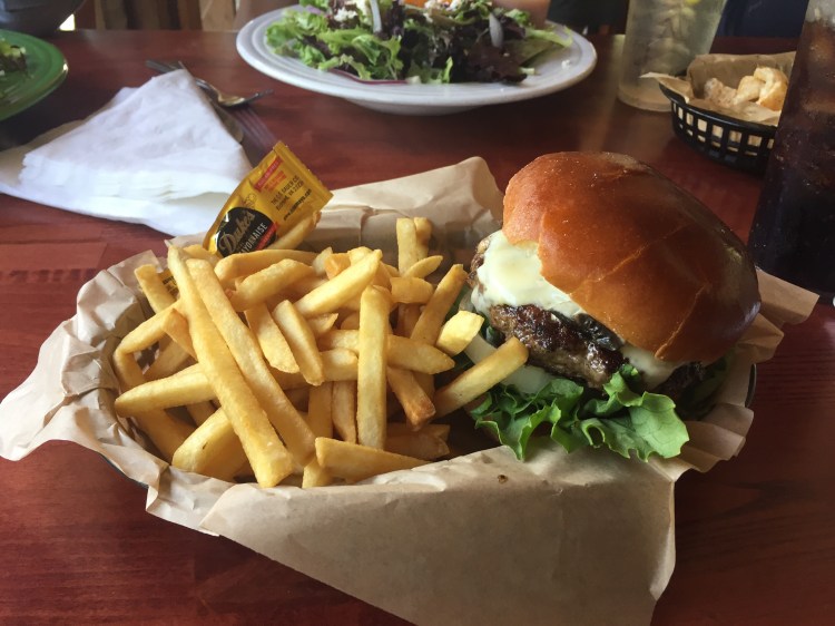 When the other hikers in the group I’ve been hanging out with came in we all got a picture with Creature. Everyone was very sad he was leaving us. The guys tried to convince him to keep hiking to Katahdin with us but he has some other adventurous plans. He gave everyone his number so he can come pick them up and take them to his house in Virginia if they need it. The whole group of us then went out to lunch at the river’s end restaurant. I got a burger and shared a salad with Cocoa. Creature ended up paying for everyone’s meal. We were all so surprised. He gave us a little talk at the end about how Jesus was drawing him to us on the trail and that we need to listen for him talking to us when we hike. Creature shed a few tears, it was sad. After lunch we all met his wife and wished him well. It’s crazy how you can meet someone on trail and get to know them so well in two days.