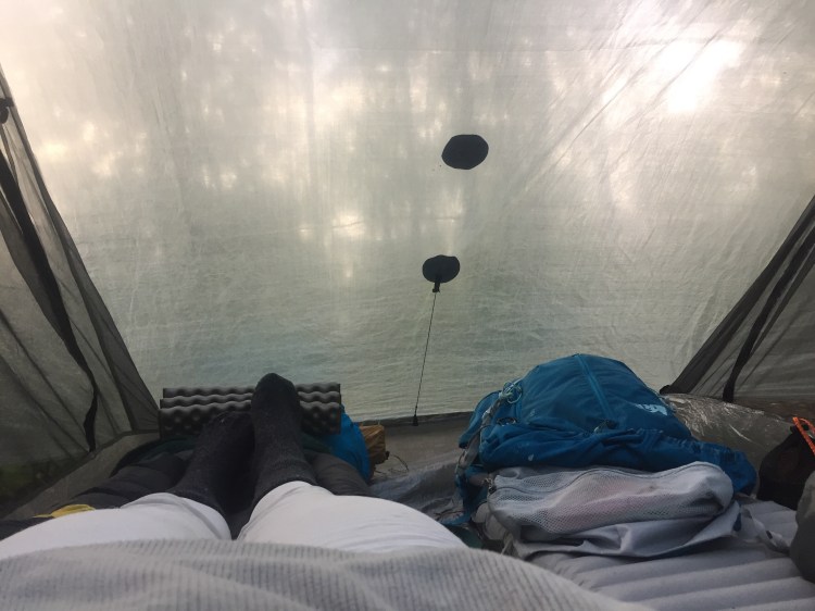 This morning I woke up at 7 and listened to the rain hitting the tent hoping it would stop. I didn’t start packing up things until 7:20 knowing that the rain would continue all day long. As I was packing up I was very happy to find how dry everything stayed in the new Duplex tent made by Zpacks that I shared with Emma, then I discovered a puddle in the corner of the tent. We decided that that puddle formed because I had my own tent in a bag pushing up against the tent wall allowing the water to drip inside rather than run off. It was after 8 by the time we left camp. I can’t believe how slow the rain makes me move in the morning.