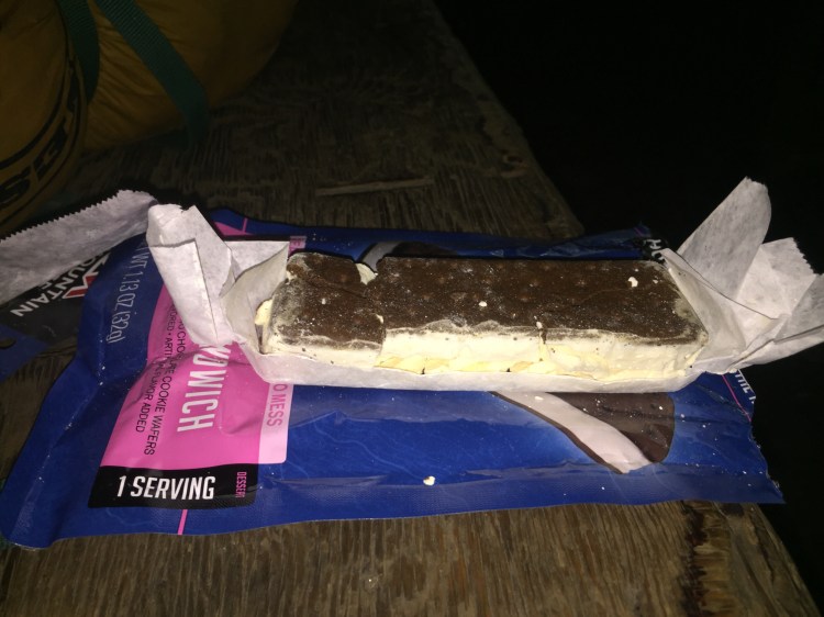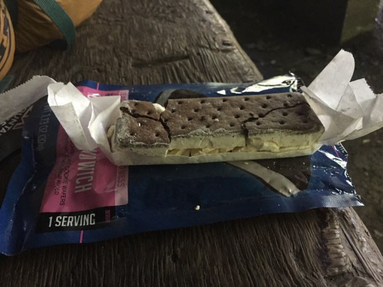 Once we got to the shelter we ate dinner and got ready for bed. We figured out that we were 67 miles from Boots Off Hostel and wanted to be there in 4 days. Tomorrow we have a long hard day with a big climb so we are waking up really early so get a head start. Before bed, I enjoyed a freeze dried ice cream sandwich that my aunt sent me in the mail. It tasted just like ice cream minus the cold and wet part with a bit of crunch. Thanks aunt Missy!