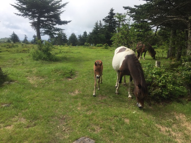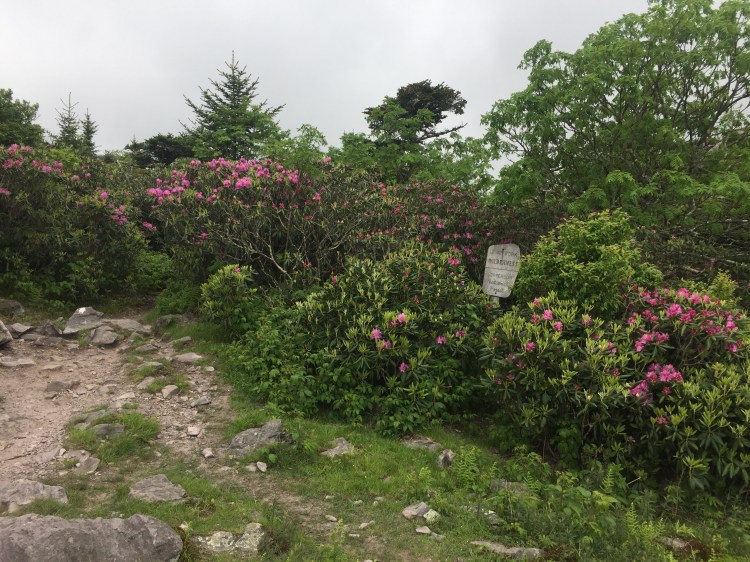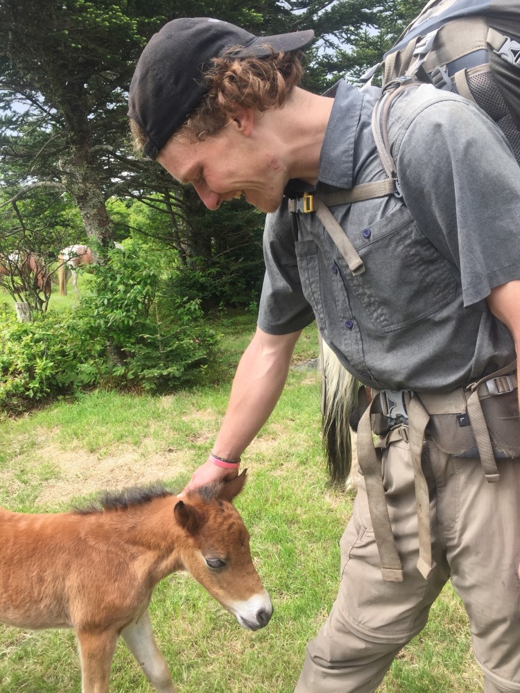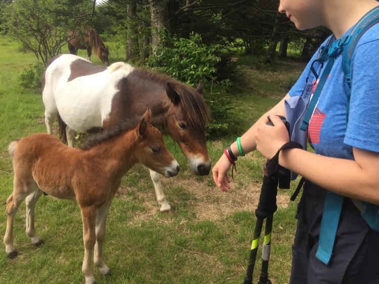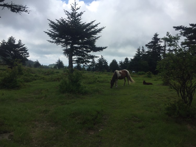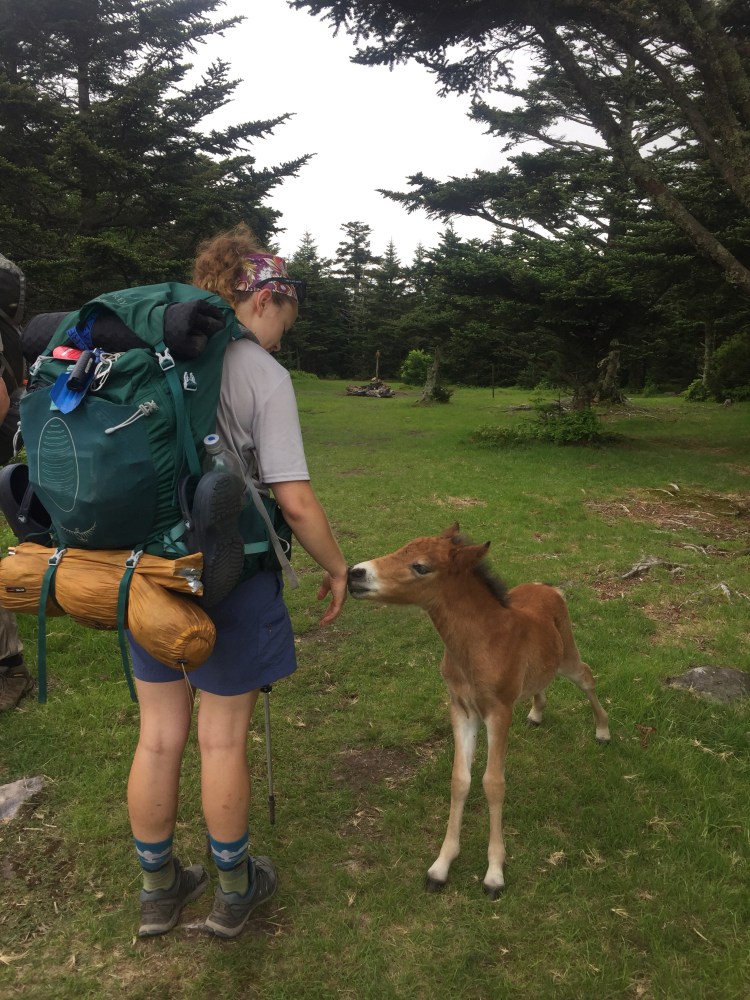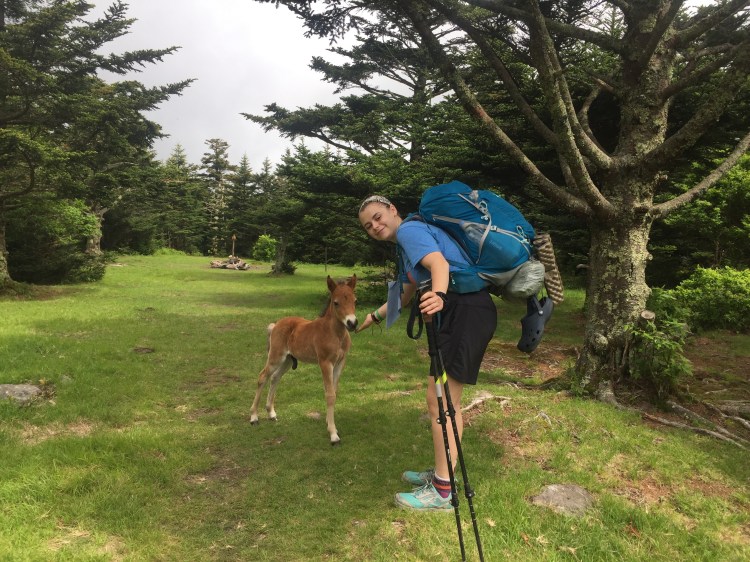 This morning Emma, Crunchy, and I all got on trail around 7:30. Emma and I saw a black bear on the hill above us about two miles into our hike. We stopped to fill up our waters for the day and eat snacks since the water source at the camp wasn’t great. Then we met up with Crunchy again at the highest point in Virginia. It is a viewless summit Mount Rogers that is a 0.5 mile hike off the AT. After Mount Rogers the three of us al hiked together through the Grayson Highlands where we got to see and pet the wild ponies. Emma was so excited, it was cute. Crunchy on the other hand had no idea there was going to be horses until we told him. The horses were so friendly. They would walk right up to you and let you pet them. Their fur was incredibly soft. The little pony seemed to be everyone’s favorite. They were all grazing on the bright green grass which created a beautiful campsite on the mountainside. We continued to hike until we ate lunch on a grassy spot by some blooming rhododendrons. We ran into more ponies and a group of high schoolers from Cincinnati who come out every year after schools ends to a different section of the AT. I thought that was awesome that their high school gave them that opportunity but wondered how they afforded all the gear since it seemed like there were so many kids.