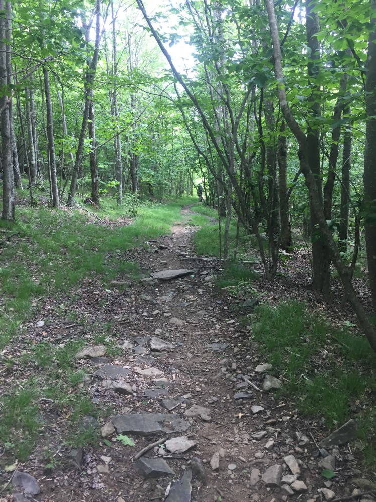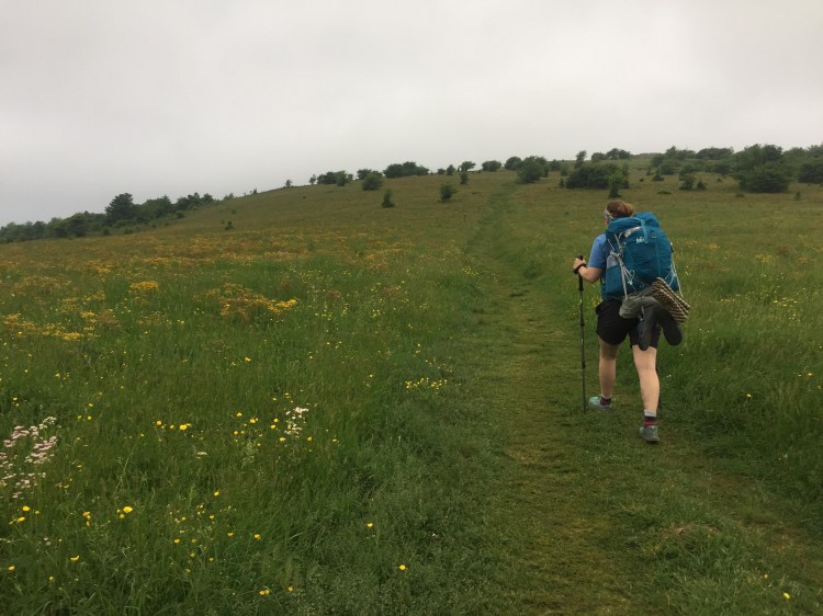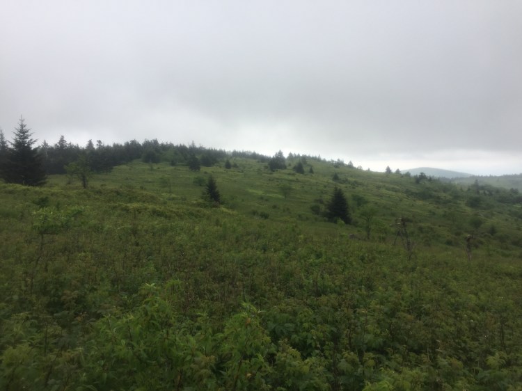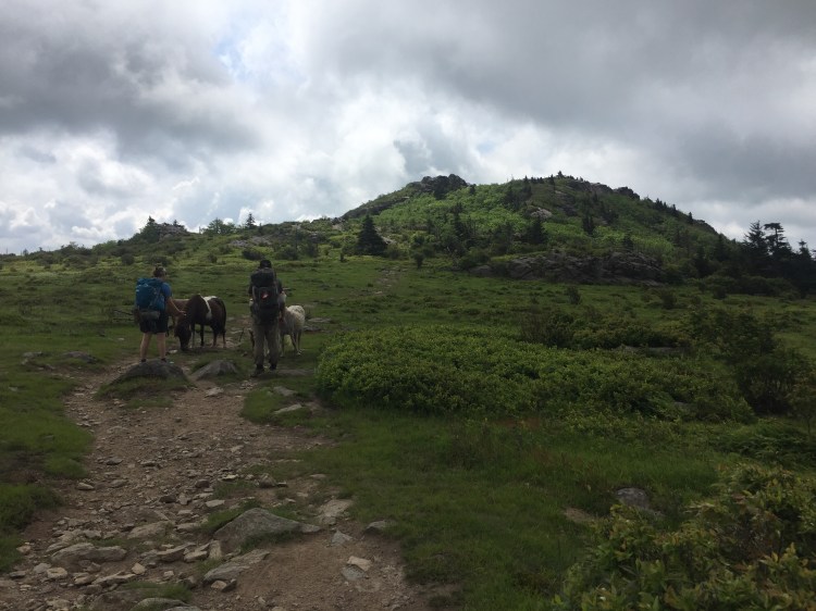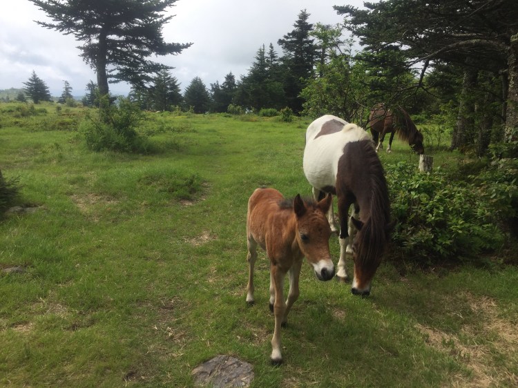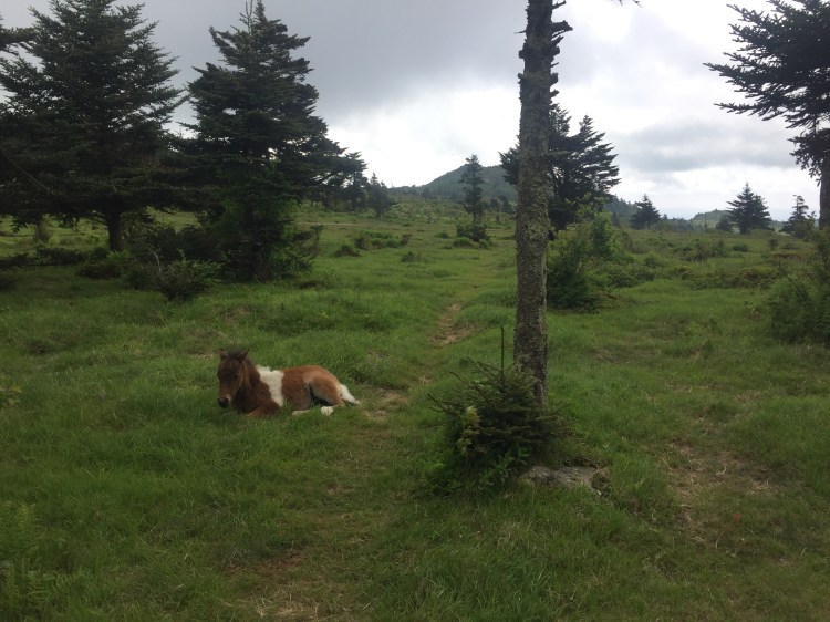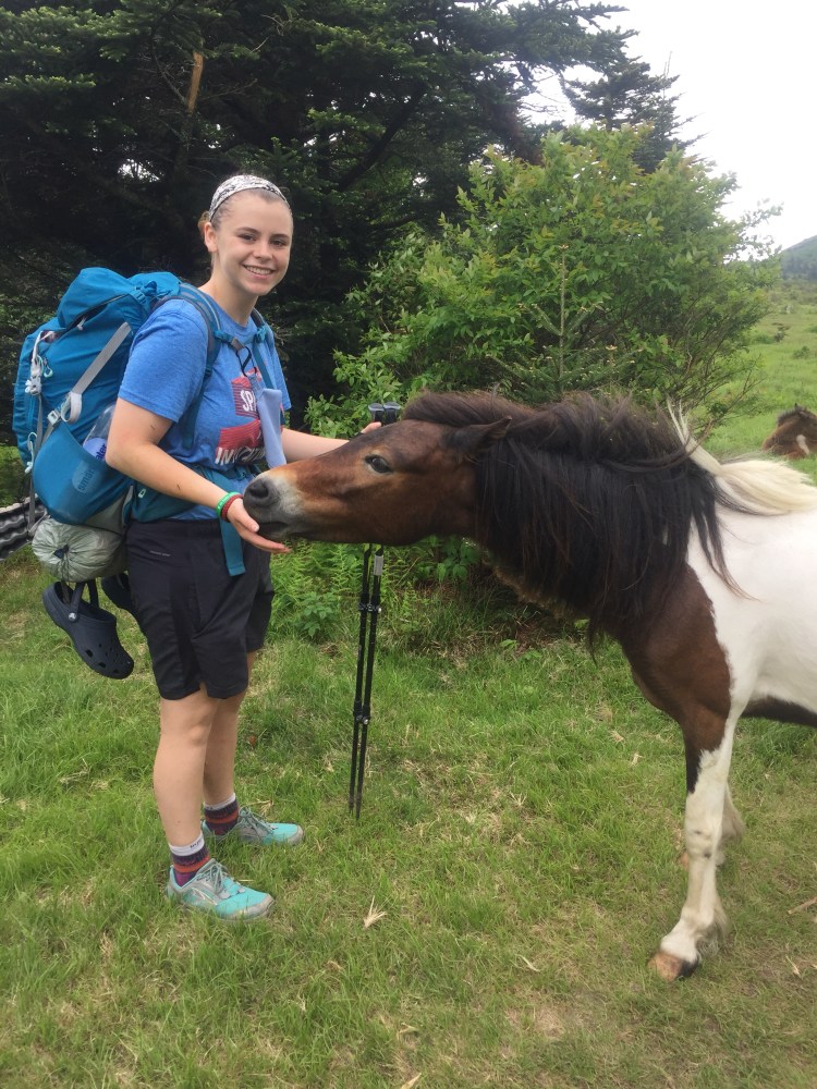 This morning Emma, Crunchy, and I all got on trail around 7:30. Emma and I saw a black bear on the hill above us about two miles into our hike. We stopped to fill up our waters for the day and eat snacks since the water source at the camp wasn’t great. Then we met up with Crunchy again at the highest point in Virginia. It is a viewless summit Mount Rogers that is a 0.5 mile hike off the AT. After Mount Rogers the three of us al hiked together through the Grayson Highlands where we got to see and pet the wild ponies. Emma was so excited, it was cute. Crunchy on the other hand had no idea there was going to be horses until we told him. The horses were so friendly. They would walk right up to you and let you pet them. Their fur was incredibly soft. The little pony seemed to be everyone’s favorite. They were all grazing on the bright green grass which created a beautiful campsite on the mountainside. We continued to hike until we ate lunch on a grassy spot by some blooming rhododendrons. We ran into more ponies and a group of high schoolers from Cincinnati who come out every year after schools ends to a different section of the AT. I thought that was awesome that their high school gave them that opportunity but wondered how they afforded all the gear since it seemed like there were so many kids.