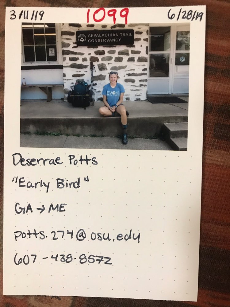 Today I woke up on the porch of the Blackburn ATC center at 7am. I slept less than 4 hours again last night which was super frustrating. I was worried about my phone never turning back on and I was in too much pain despite taking ibuprofen (or something). My med kit is just a bag of random pills that I can’t distinguish from each other except for melatonin, turmeric, and the rest are for pain, inflammation, or headaches. I got my stuff packed up and put on my wet clothes. There was a hanging scale on the porch so I weighed my pack. I haven’t weighed it since my first week in Georgia but this time it weighed 27 pounds without water and only one day or less of food! My pack has definitely gained a lot of weight by me adding tons of items to it since I started. It is easy to add things to my pack because I have so much space in it, but I am slowly running out.