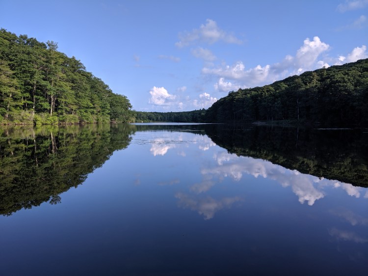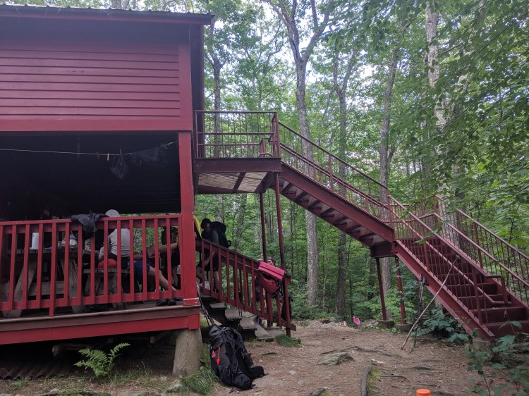 ur destination for the day was Upper Goose Pond cabin. I was planning on staying at this cabin for a long time because I heard it was awesome. When we arrived it lived up to its expectations. There was a beautiful pond where we could swim and canoe along with an enormous closed in cabin with bunks that had mattresses on them. We were greeted by it’s volunteer caretaker for the week who explained the rules and where we could find things. The place was amazing. I didn’t swim or do much at night because I was so worn out from the past week. I ate a lot of food, looked at the lake, blogged, and read a book Flamingo and I have been sharing the pages from. Flamingo reads the book, tears out the pages when he’s done and hands them to me. They will probably be used to start a fire later down the trail. I’m glad to be at a peaceful indoor space tonight where mosquitos shouldn’t eat me!