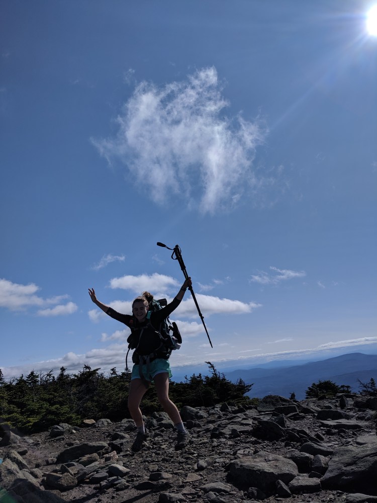 I left the south peak and headed up the north peak. The only other people I saw hiking on the whole mountain were two day hikers I passed as they were coming down from the north peak. The one mile to the north peak was on a completely exposed trail marked by Carins (the correct and ethically built ones). I couldn’t believe I had finally made it to the white Mountains and how freaking pretty it was. At the top I tried to take my own picture with a timer on my camera. I wanted to stop and eat food because I was so hungry but I decided I had better wait until I was protected by the trees. I left the cold chilly summit and headed to the shelter 2-3 miles downhill. The descent was steep but I know the worst of it will come tomorrow. At the shelter was one other hiker named “little hill” an elderly gentleman with pure white hair. He hiked here all the way from Georgia this year too. I ate a ton of food and got in my sleeping bag as fast as I could because it was so cold. It’s supposed to get down to 36 tonight! I wish I could have gone further and camped at a lower elevation but I had very limited options. My next camp option was 9 more miles away which would definitely be completed in the dark. I’m just really happy how my first day in the white mountains went.