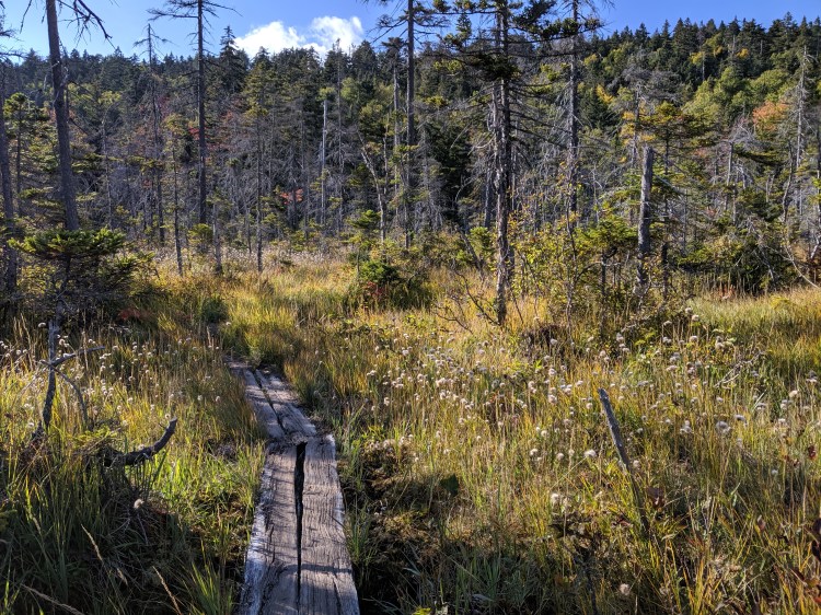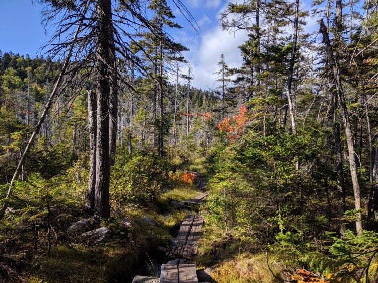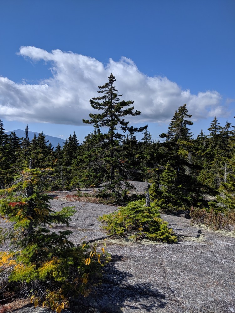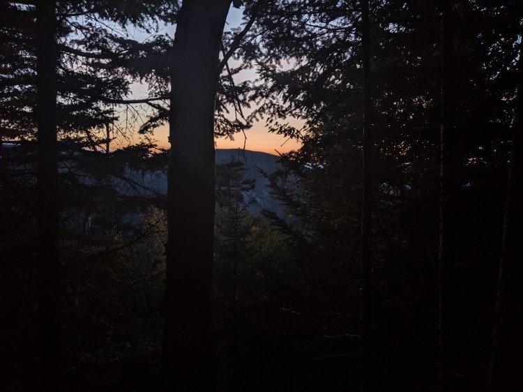 I sat at the shelter for a while debating if I should push on and seeing what was in store for the days ahead. At 6pm I left and continued on five more miles to the Maine border. It got dark really fast and soon I was climbing mount Success in the dark with my headlamp. The sunset was beautiful through the trees. Mount success involved more rock climbing than hiking. It felt really hard in the dark with my increased pace. Eventually I reached the top where I walked across some alpine bogs and ran Into a hiker setting up his tent on the summit. It was really nice night for camping with the temp around 50 degrees. A sharp contrast to the recent freezing cold weather in the whites.