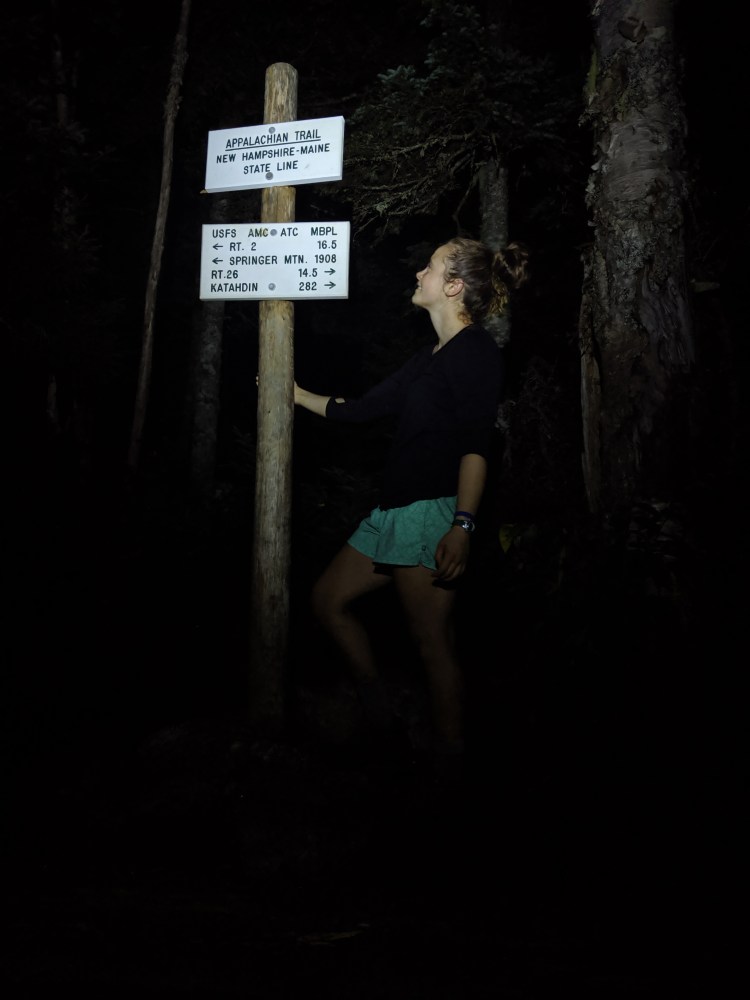 I descended mount success and crossed a giant boulder chasm that was really dangerous and scary before crossing the border. I expected people to be camped there but I was empty. I took some pictures of myself which were kinda hard because I had to set up a timer and my headlamp for light. The moment needes to be documented! I thought I was going to cry but I didn’t. Getting to Maine feels like such a big deal. I can officially say that I have walked from GA to ME!