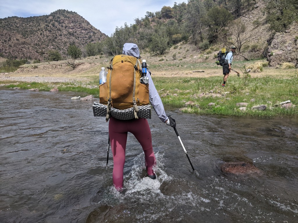 Heidi and I followed 12 pack the rest of the day and I was very glad I did. The river was a lot higher and faster than I expected. It was up to my knees and sometimes the bottom of my shorts in some place. It was flowing at about 400 cubic feet per second. I can’t imagine how treacherous the river crossings have to be in a year without a drought. I had to be very careful to keep my balance and not fall in on every crossing. 12 pack loves to fly fish and he spends a ton of time on rivers. I learned a lot about fly fishing, fish, and rivers in general from him today. He also helped with navigation SO MUCH. Sometimes it’s nice to hike behind someone else on this trail and turn your brain off while they navigate for you. I would say I have had to navigate on this trail more than any other trip I’ve been on. Sometimes when we found a foot print we would consider it good enough evidence that we were close to the trail. We know that we have to head upstream on the Gila River and stay within the river coridoor. On both sides of the river there are very tall canyon walls/ Mountains that contain the river and it’s banks in a certain area.