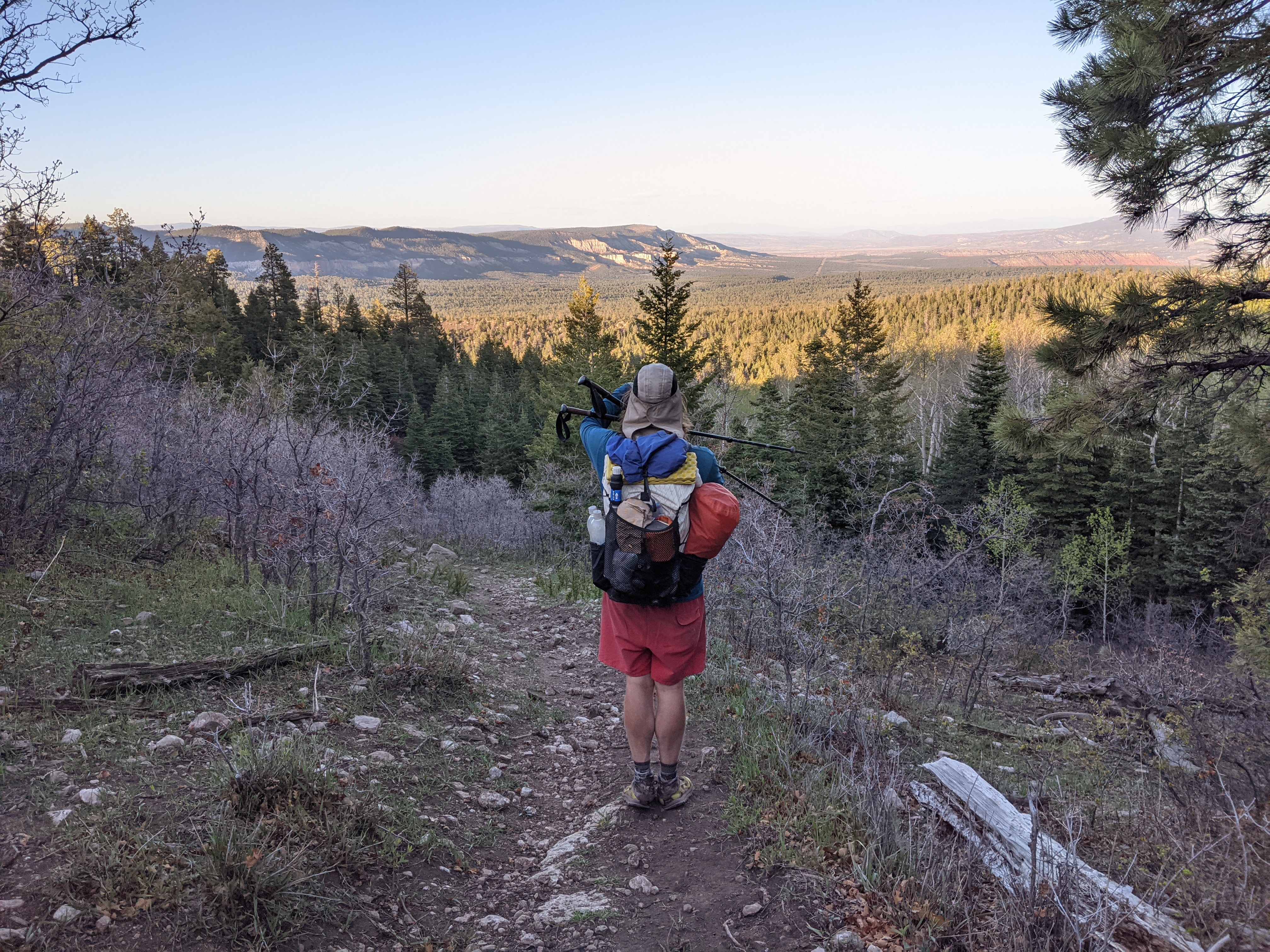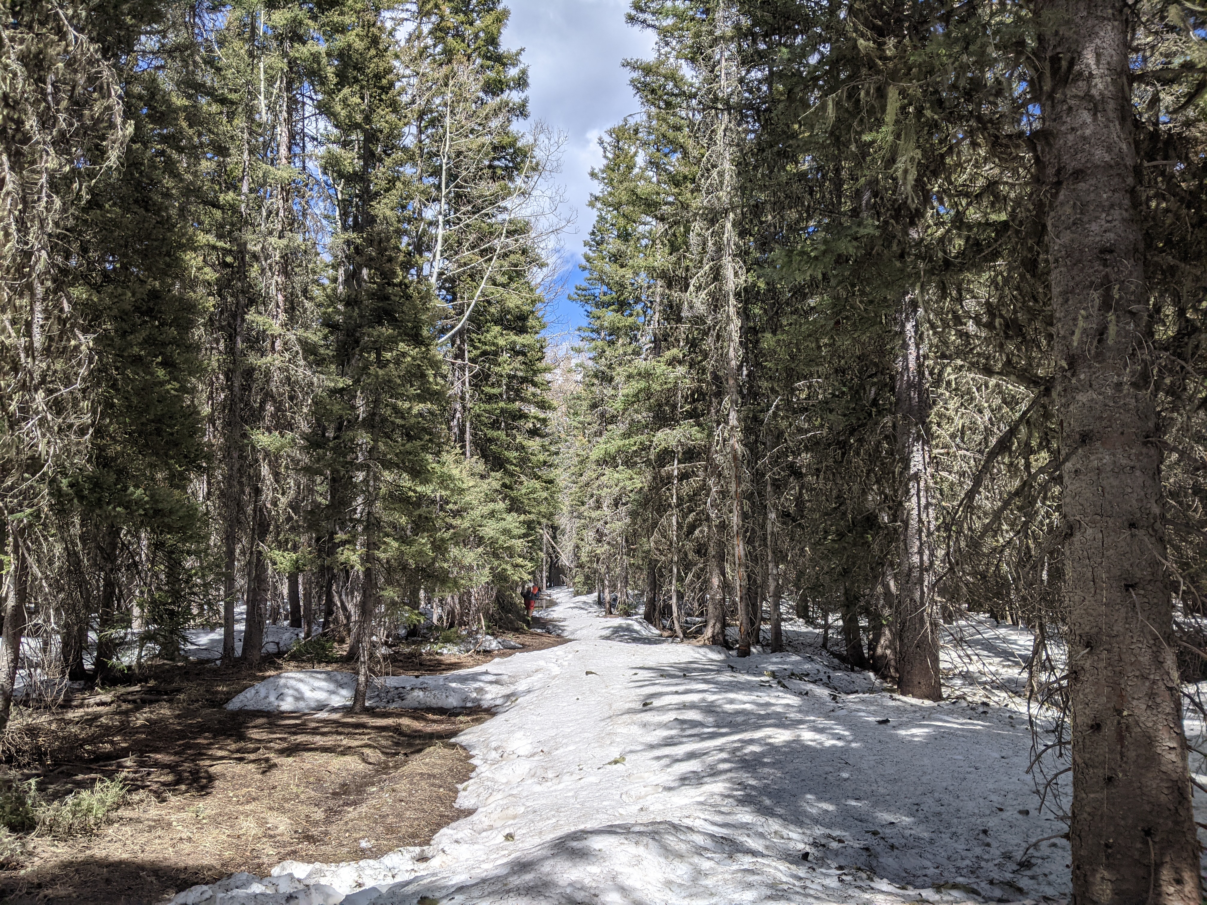 The trail gently switch backed climbing the side of a mountain until it reached 10,000 feet where it would stay around for most of the day. A lot of the dirt was a clay red color until I got into some alpine meadows. Today reminded me a lot of some of the hiking I did around Colorado last summer. Such a sharp contrast compared to the desert we came from just yesterday. There were very old trees all around. I think most of them were ponderosa pines or aspens. When I reached the first green alpine meadow I immediately saw an elk that darted away.