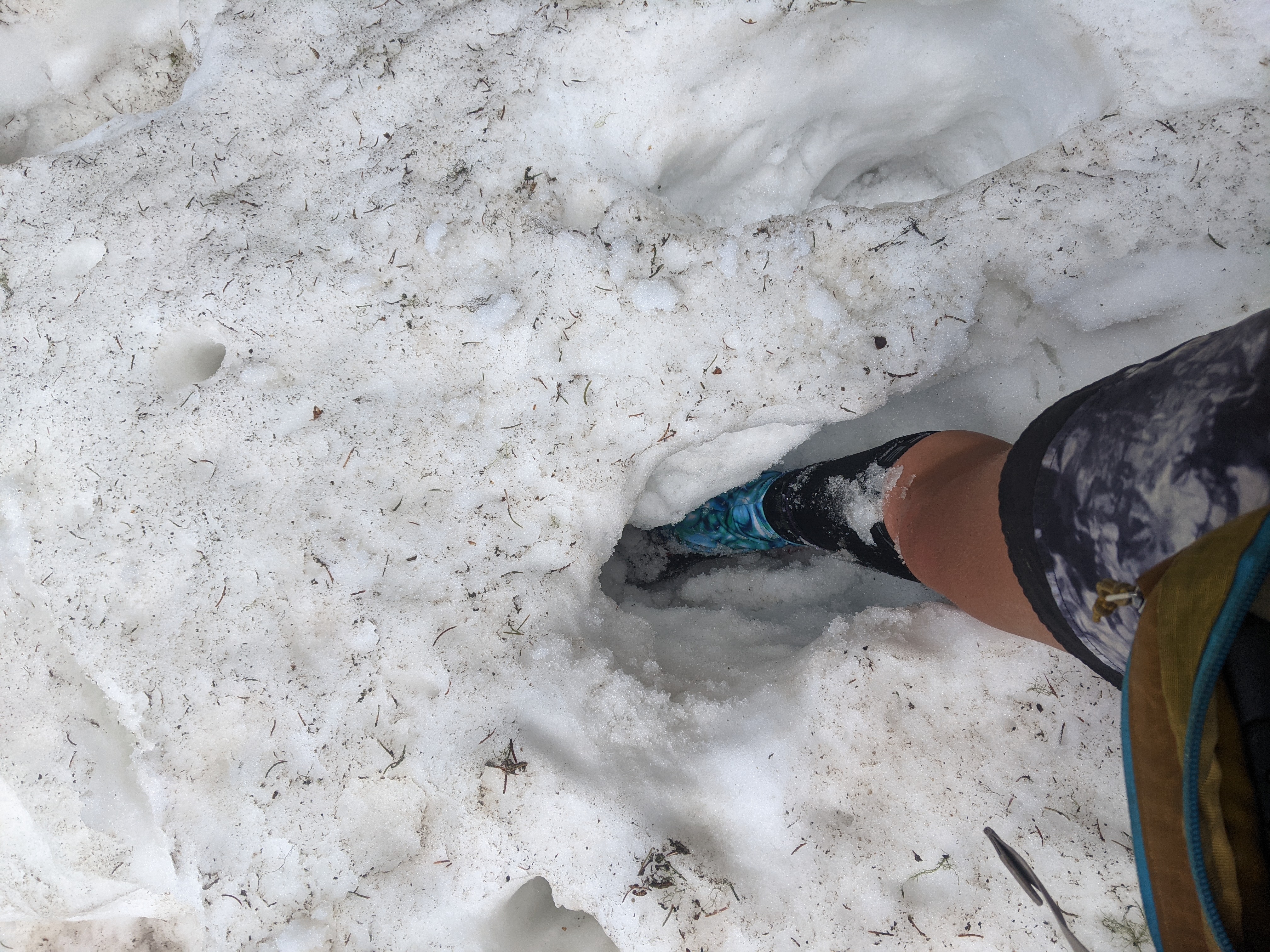 I kept passing through alpine meadows with some streams running through them for the rest of the day. The streams were full and rushing with cold water from snow melt. I took my lunch break at a reservoir and then ran into Free Fall who I hiked around for the rest of the day. After my lunch break began a long section of wet feet. There were patches of deep snow sporadically for the next 8 miles. They weren’t long stretches but definitely enough to slow me down. I would try to walk on top of the snow, until I would bust through it. Sometimes the snow would come up to the tops of my thighs when that would happen and it was hard to get out. Thank goodness for trekking poles. Although the snow was jarring, it wasn’t as bad as I thought it would be. If I wasn’t post holing through the snow, I was walking through ankle deep snow melt water that would pool right on the trail. I hope Colorado is this “easy” but it’s almost garanteed not to be.