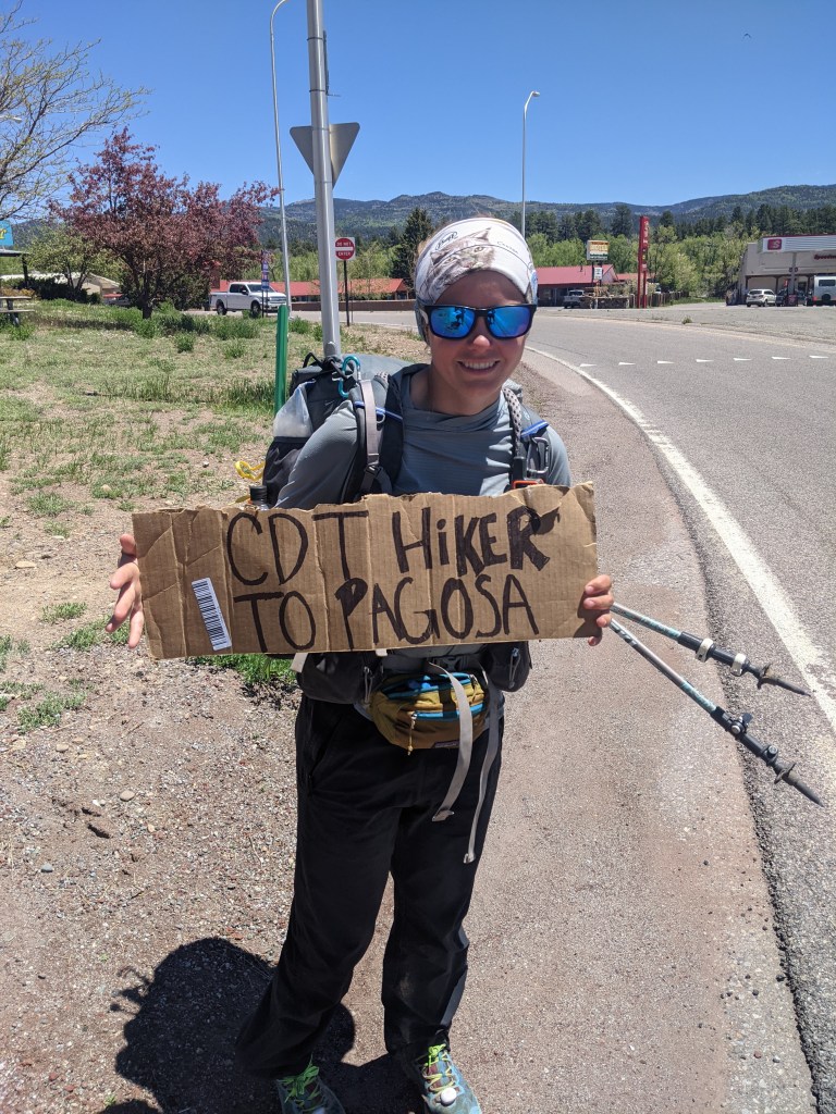 When we got to Chama it was time to get business done. I grabbed some coffee from Rio Chama, a sandwich from Subway, and headed to the Y motel. There I talked to some other hikers while eating my sandwich including Melissa, Old Head, and Melon. Before leaving to hitch hike to Pagosa, I returned the snow shoes I was borrowing and made a sign. 12 pack and I stood on the road for about 40 minutes before getting picked up by a nice family heading through Pagosa. It was about a 40 minute drive before we got dropped off in down town.