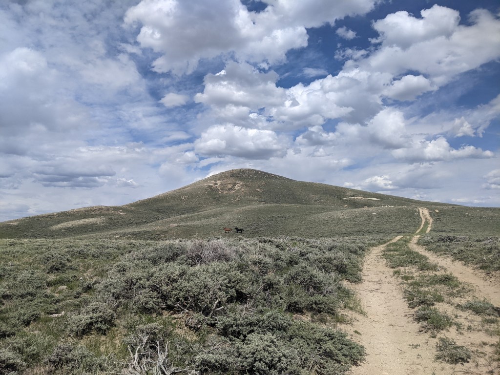After our break at the water cache we started climbing to one of the highpoints in the basin. I was able to get a little bit or service here and make a call to my boyfriend. I miss him as always! Near the highpoint I saw a couple of wild horses roaming around, my first ones ever! They ran away from us as soon as I saw them. I tried to get a picture but they are very small in the distance.