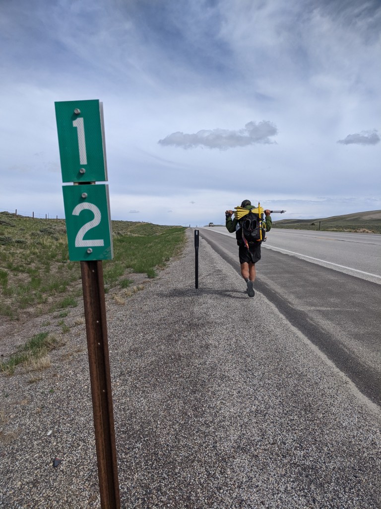 Today 12 pack and I woke up to clouds of fog rolling over our camping spots. I was really hoping it wouldn’t rain last night because I couldn’t set up my tent. I slept in until 7:30ish and we started hiking around 8 which is pretty late for me. The morning was spent hiking a flat road through the chilly fog until the sun started to burn it off. We eventually could see the hills in the distance again although it did look like it was going to storm for the rest of the day. Around 10am we got to call our friend Jenga. He told us he got a hotel with Hummingbird in Rawlins and that we could get there and crash tonight if we wanted to. Of course 12 pack and I both really wanted food and a bed, but more importantly we would get to see Jenga again! This motivated us to get to town tonight. We didn’t even need to change our daily milage plan to do it, we just needed to walk to the highway and get a hitch.