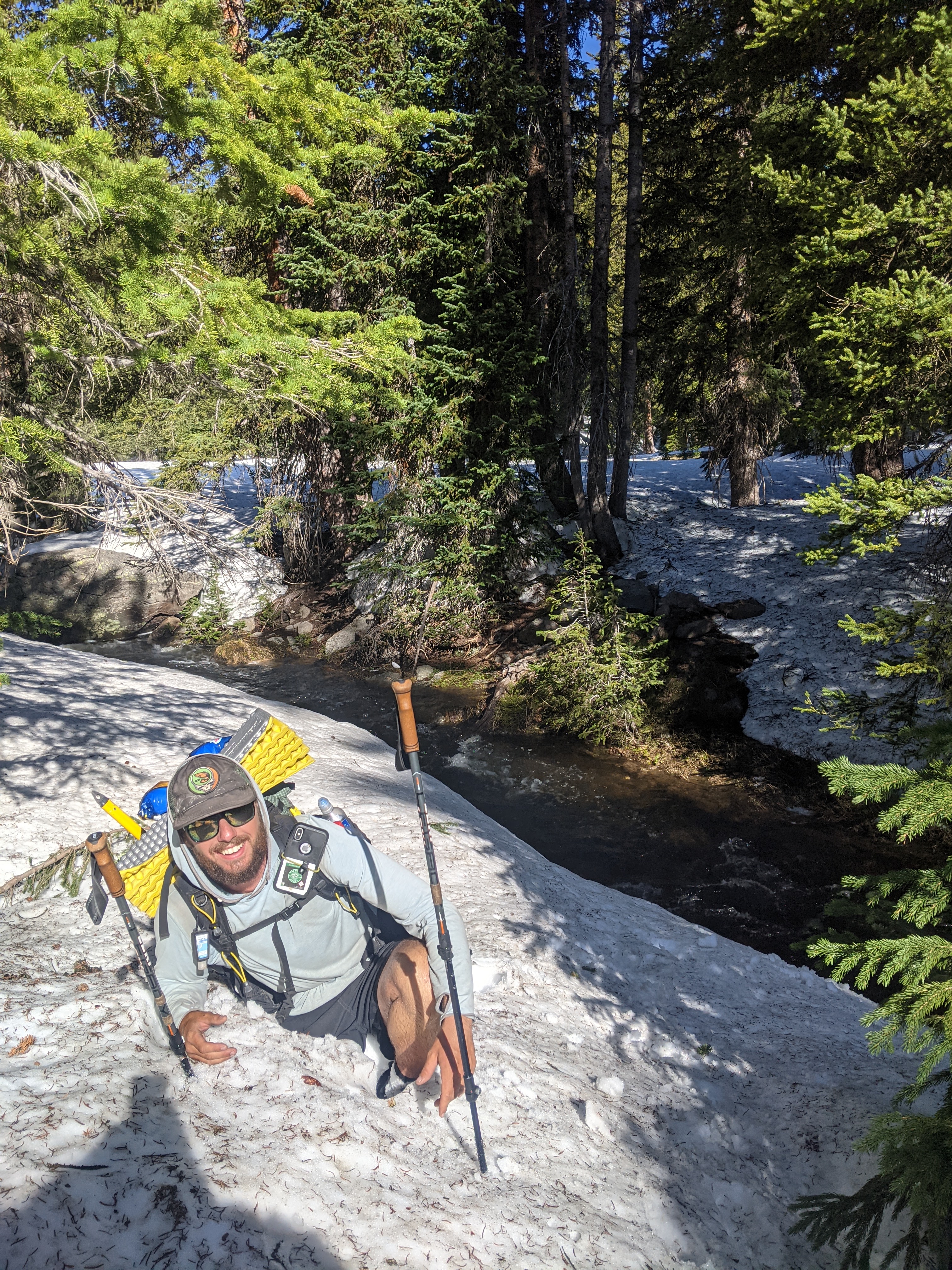 The trail was completely covered in snow again as I expected. I assume we won’t see very much actual trail between here and our next town, Steamboat Springs, Colorado. Even though it was early in the morning, the snow was still soft and we were post holing. It was absolutely exhausting. We had to cross quite a few small rivers that were very full of freezing snow melt. Everytime I had to do it my feet would ache for a few minutes because if how cold it was. Some of the crossings were above my knees and flowing very fast.