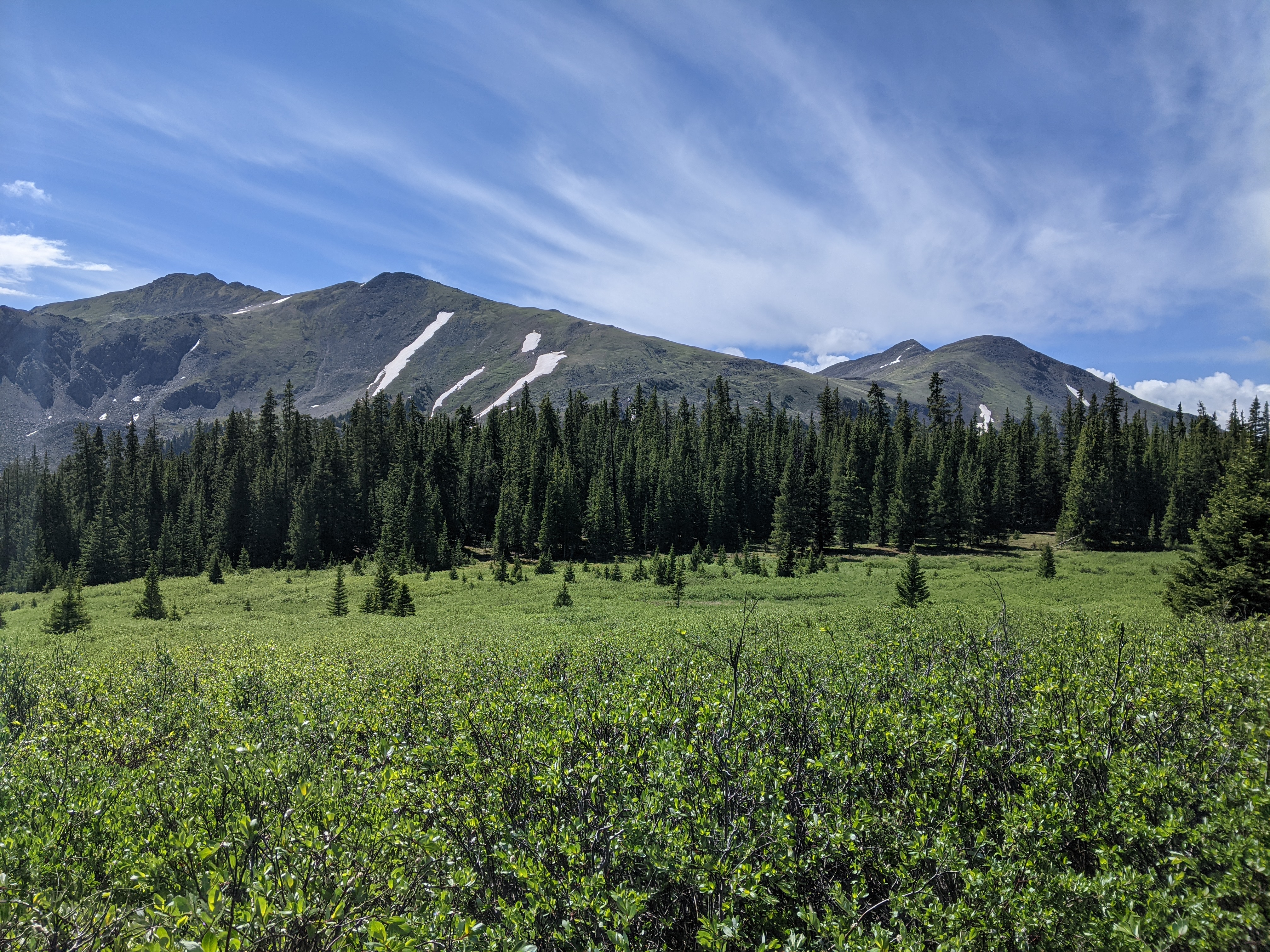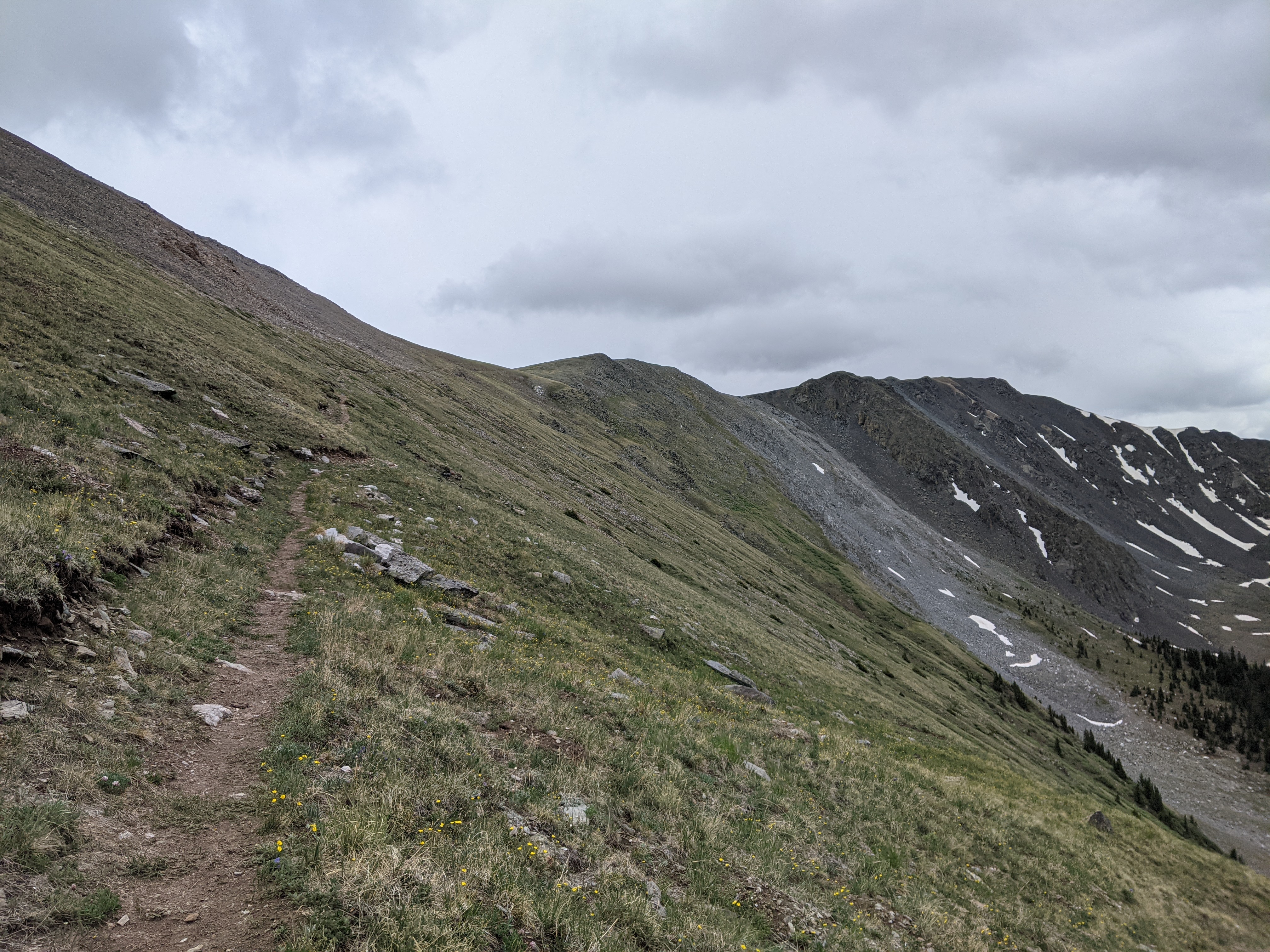 I started a long ascent of almost 3k feet to Cottonwood pass. I was in the clouds most of the time until I got close to 12k feet. There were a couple of small creeks to ford but I found some longs over most of them. When I did have to walk straight through one it wasn’t so bad because my feet were already soaking wet. I was so happy once I was in the sunshine. It made me feel like the high route was a good idea! When I got close to Cottonwood pass I saw a massive amount of hikers coming down from the top. I thought it must be some day hikers just because there were so many of them but it turns out that they were all CDT thru hikers including Money! It was good to see him. We were both in a rush trying to get over our passes before the storms hit. He told me they are supposed to start around 4pm. When I got to the road I was very surprised to find it was a busy highway. There was a trailhead with so many cars parked at it and people hiking up to a view point. I was definitely expecting a dirt road with maybe one car at the trailhead.