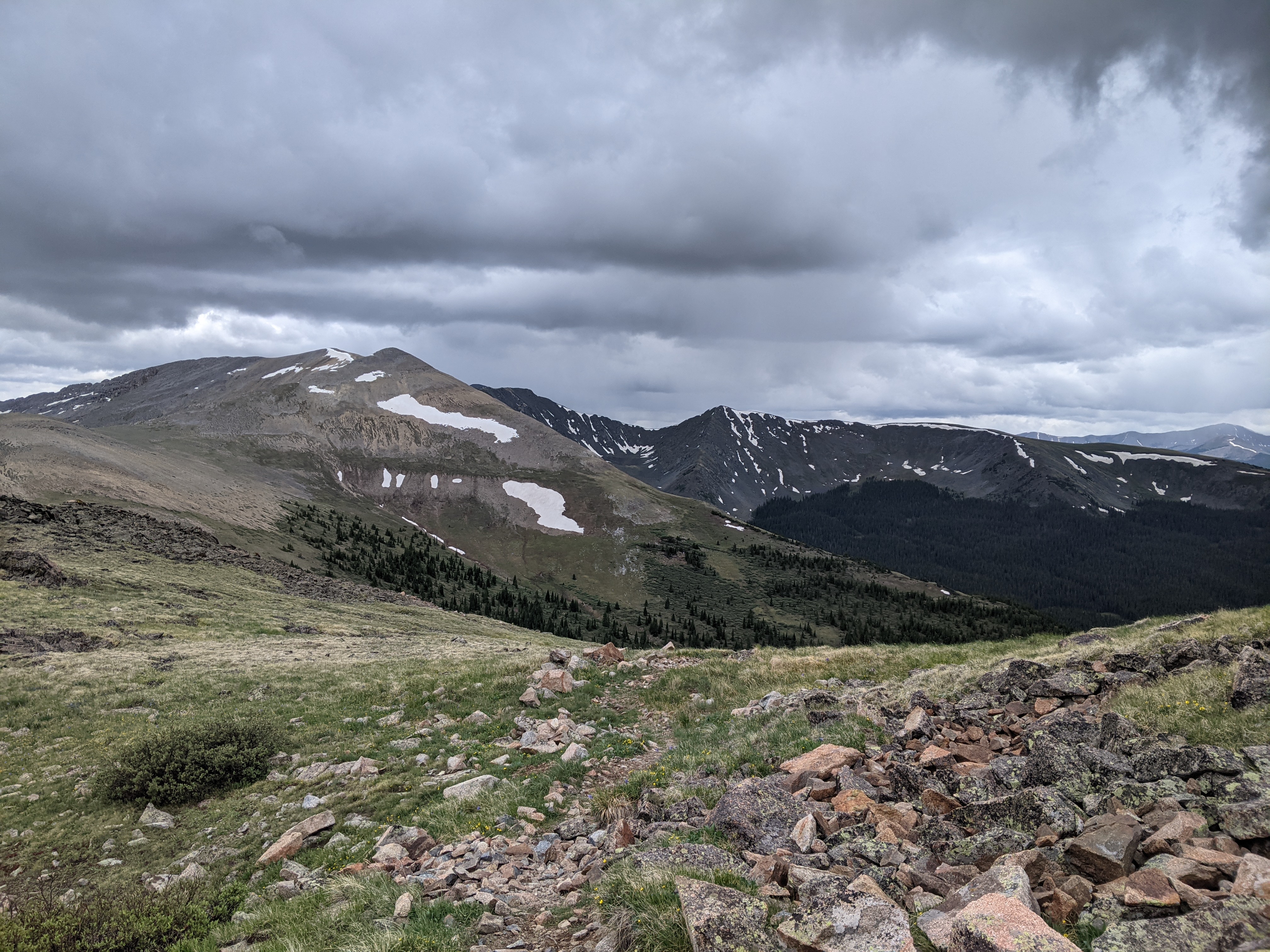 As I was walking along the ridge I got really bad anxiety again! I started crying and breathing really hard and wishing I was at home in bed. I ended up calling Luke and I was so happy he answered and I had service. Getting to talk to him made me feel better. I had to go over two high points/ passes before I knew there would be a safe place for me to camp in the event of bad weather. The sky didn’t look great at all and I could see rain in the distance. It ended up hailing on me for about 10 minutes. I passed a couple of NOBO CDT hikers sitting on the side of the trail under the cover of a tree waiting to see if the sky would clear a little bit before hiking on. Since I was so close to the top of the second high point I kept going. The sky definitely didn’t look great but it wasn’t actively precipitating. When I got to the top of the pass it looked like sunny weather on the other side. At least for a little bit. I was relived that I could now hike downhill for a while and watch to sky to see if I would need to set up my tent in the valley.