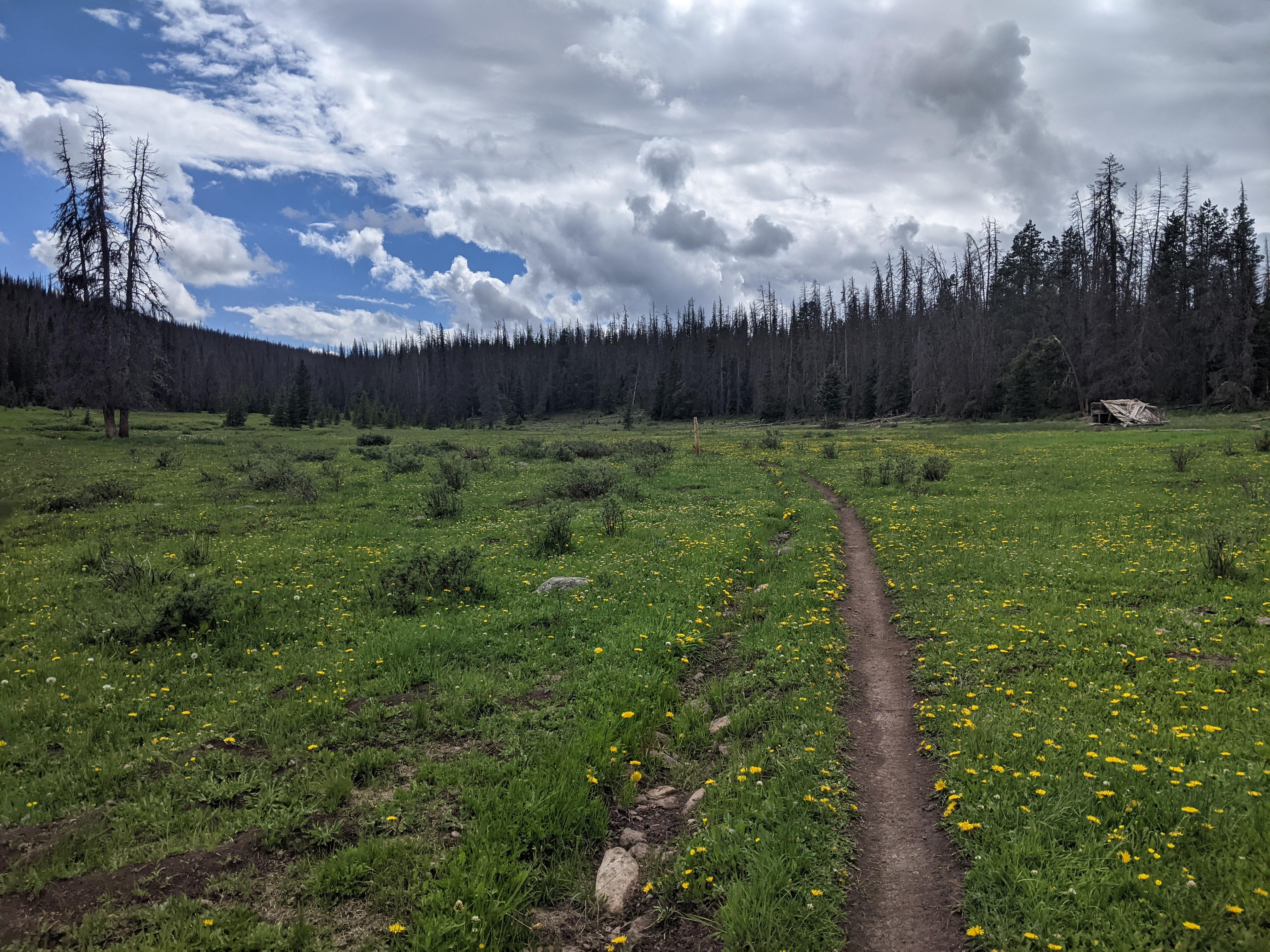 The rest of the day we hiked in a green tunnel of trees which was so nice after all the crazy exposed mountains we have been on. It’s so nice to not worry about being the tallest thing around if a storm breaks lose. One notable thing about today is that I hardly saw any water compared to the rest of Colorado. I actually have to start paying attention to where I can find it now that the snow melt has all run off. Before finding a place to camp on Sargents Mesa, 12 pack and I filled up all of our water bottles at the nearest stream. The day ended with a walk through a beautiful meadow. When we set up camp at 5pm we had hiked 25.5 miles! Not only that but we managed not to get rained on at all despite the bad weather reports and thunderheads looming. I was so happy with how today went!