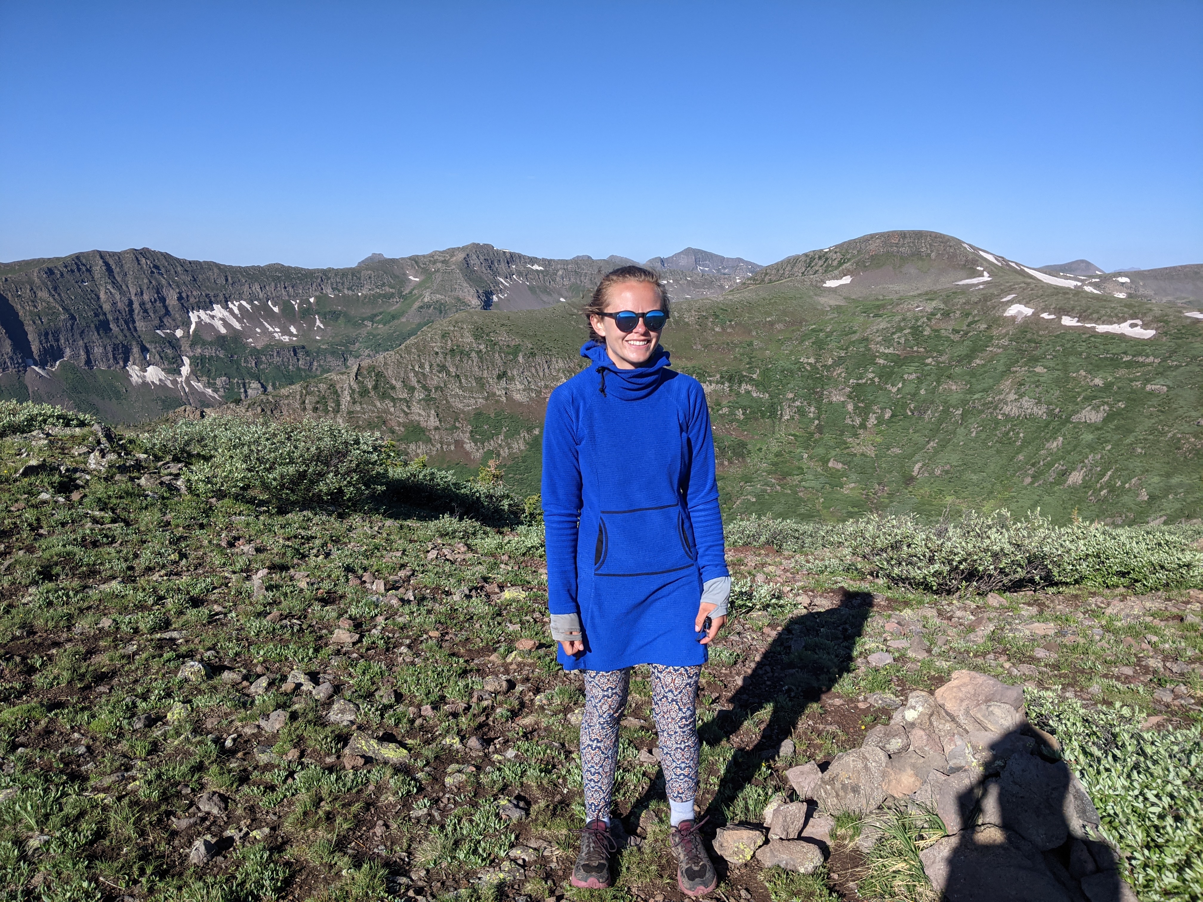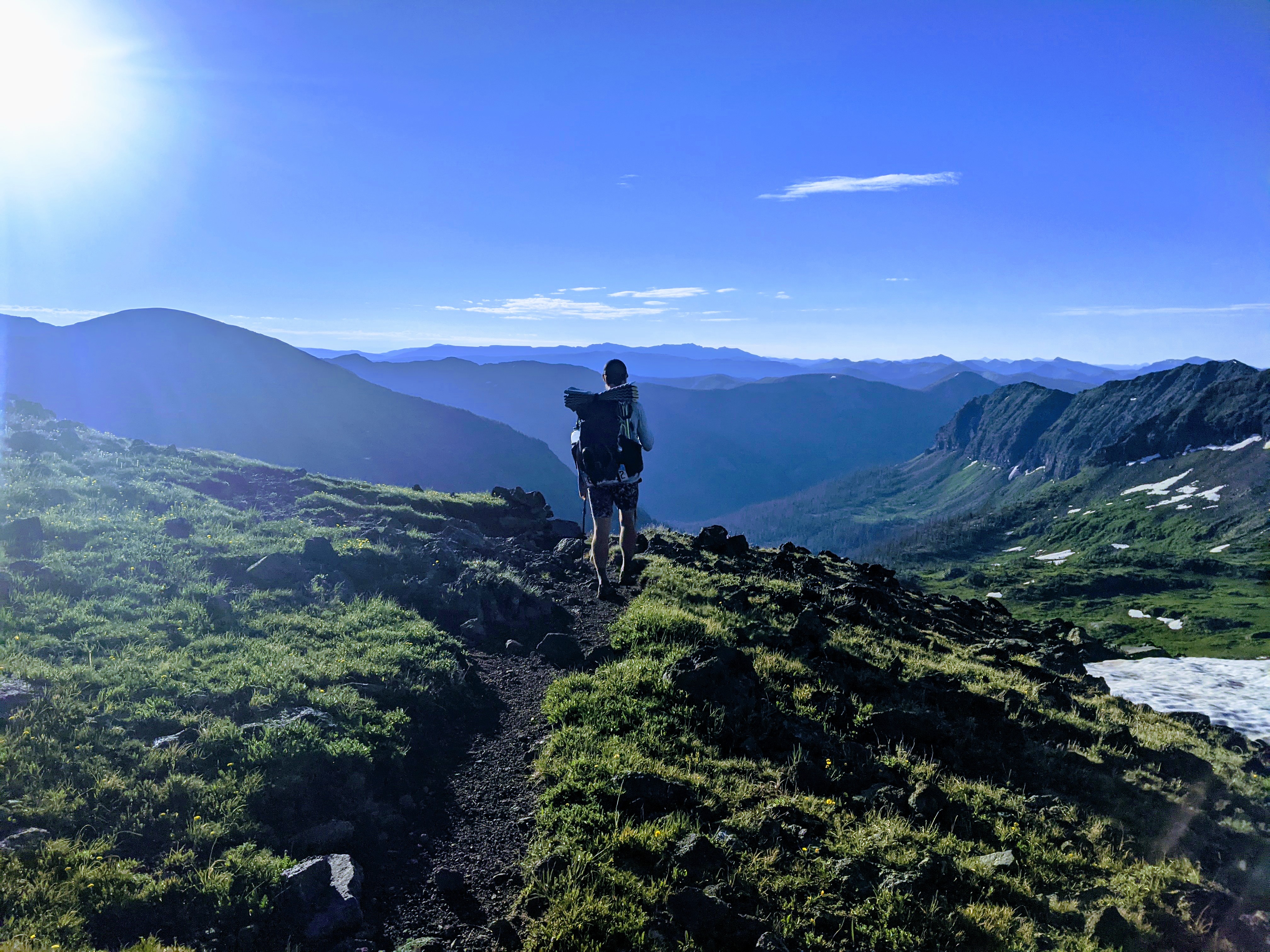 This morning I started to get ready around 5:15am. I did not sleep last night AGAIN. I am feeling so exhausted from all this not sleeping. I left camp before 12 pack. I was happy to hike by myself for a little bit this morning and take my time. For breakfast I drank a protein shake that I put 24 g of protein in, carnation breakfast, collagen, and a packet of chai tea to give it some spice. This is my normal breakfast for this trail. It’s an easy way to get in calories fast in the morning when I don’t want to take time to eat anything. At the top of the first climb, I knew I would get some cell service so I took the time to make an Instagram post and send some texts. If it wasn’t so early I’d give someone a call. 12 pack caught up to me here and we pretty much hiked the rest of the day together. There was a waypoint on the map marked “knife edge” and it made me so nervous. I definitely do not like very sketchy hiking and the words “knife edge” give me visions of horribly exposed hiking with drop offs on both sides of me. Lucky for me, I thought the waypoint was poorly described and there was no snow on the trail! Other hikers comments made it sound extremely dangerous. It ended up just being a contour around a bowl with very steep walls, a narrow trail, and a drop off on one side but not both. The part where there could potentially be a drop off on both sides was a very wide and flat trail with enough room to make me feel comfortable. I made a hairpin turn and contoured around the other side of the mountain. I was so relieved! 12 pack was in front of me and I saw a deer practically jump off a cliff between us and run above him on the extremely steep slope. I yelled at him to look at the deer so he could pay attention to possible rock fall if it ran above him. It didn’t and all was fine. When we took a break for lunch 12 pack didn’t even realize that we already did the Knife Edge. I thought it was funny that it was that anticlimactic.