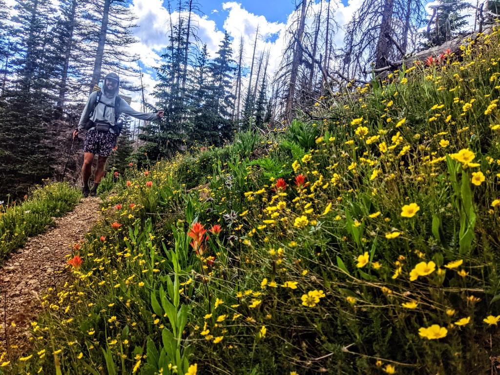 I hiked pretty slow the rest of the day and took my time. My left knee has been hurting pretty badly. Yesterday I took a bad fall and banged it up and bent it very hard. This morning I took another bad fall where I landed directly on my knee cap and broke my sunglasses when my face softly hit the ground. I’m really hoping I just bruised it very badly. It’s the knee I had surgery on last spring. The views got even better and I stopped to take so many pictures. As I got closer to camp the sky started to get dark and stormy looking again. I ran into 12 pack at a water source and he let me know that it was the last water before our best camping option. I filled up before we hiked down to a meadow and set up our tents as it started to rain again.