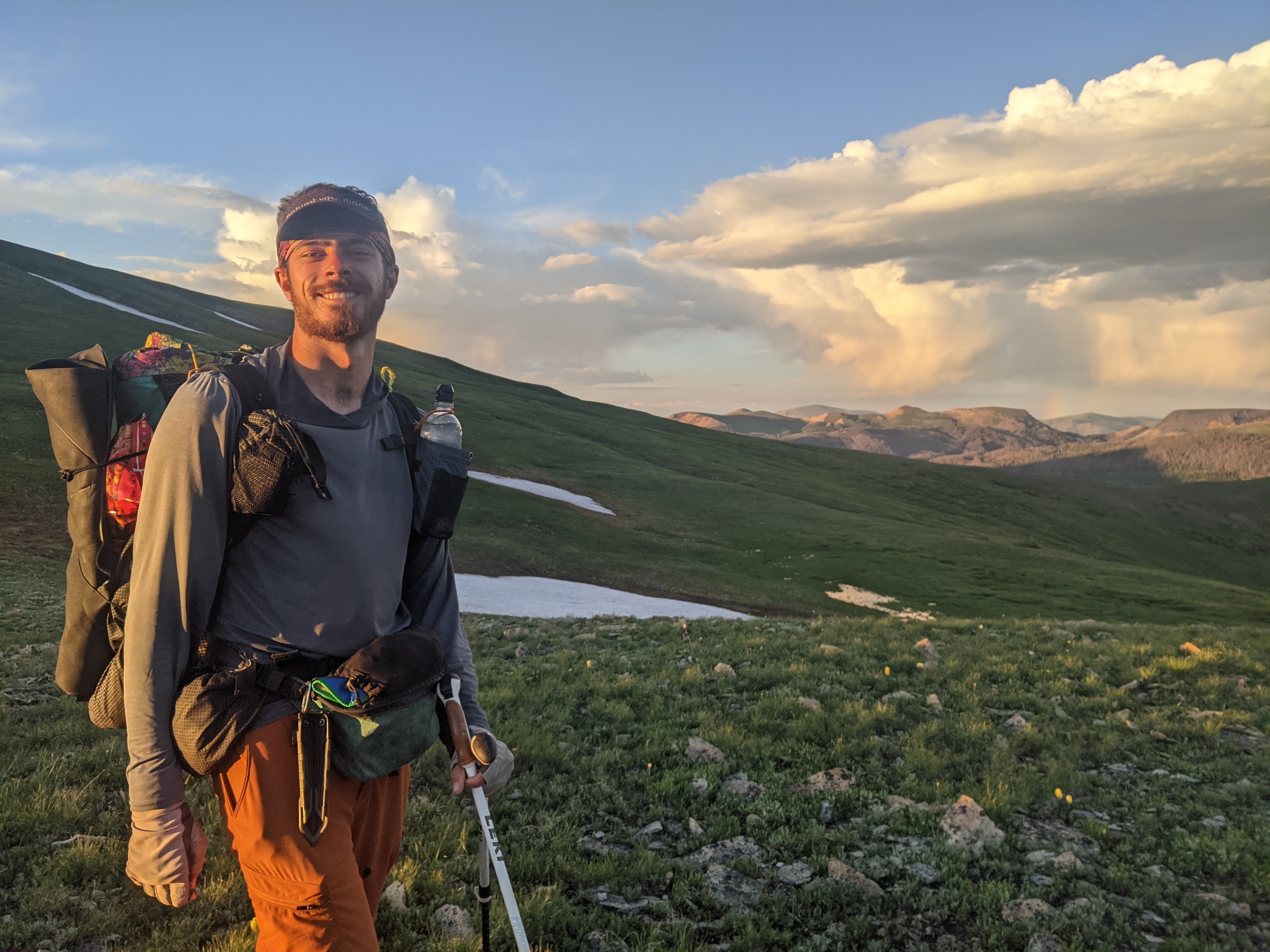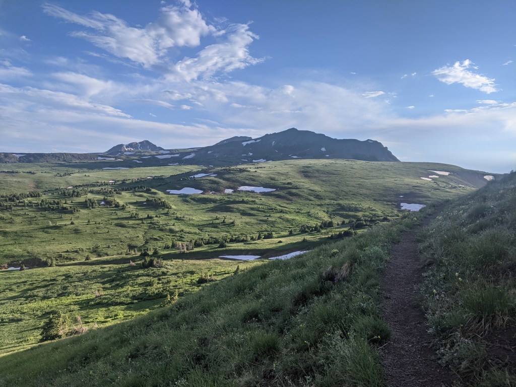 12 pack and I continued hiking at 5pm. I absolutely love the way everything looks after it storms. I keep waiting to see a rainbow appear after all the crazy storms we have seen but it hasn’t happened yet. The rest of the hiking was incredibly beautiful. We went through a lot of grassy green alpine meadows. Around golden hour I thought I finally saw a person that looked like it could be Jenga in the distance. About 3 miles later it was confirmed to be him! Right before camp 12 pack I witnessed a herd of about 50-70 elk being chased around the valley floor by two coyotes. It was so interesting to watch such a large group of giant animals be hunted by two smaller predators. We were far enough away that they looked like small dots but it was such a cool event to get to see. I’m not sure if the coyotes were successful in killing any elk or not.