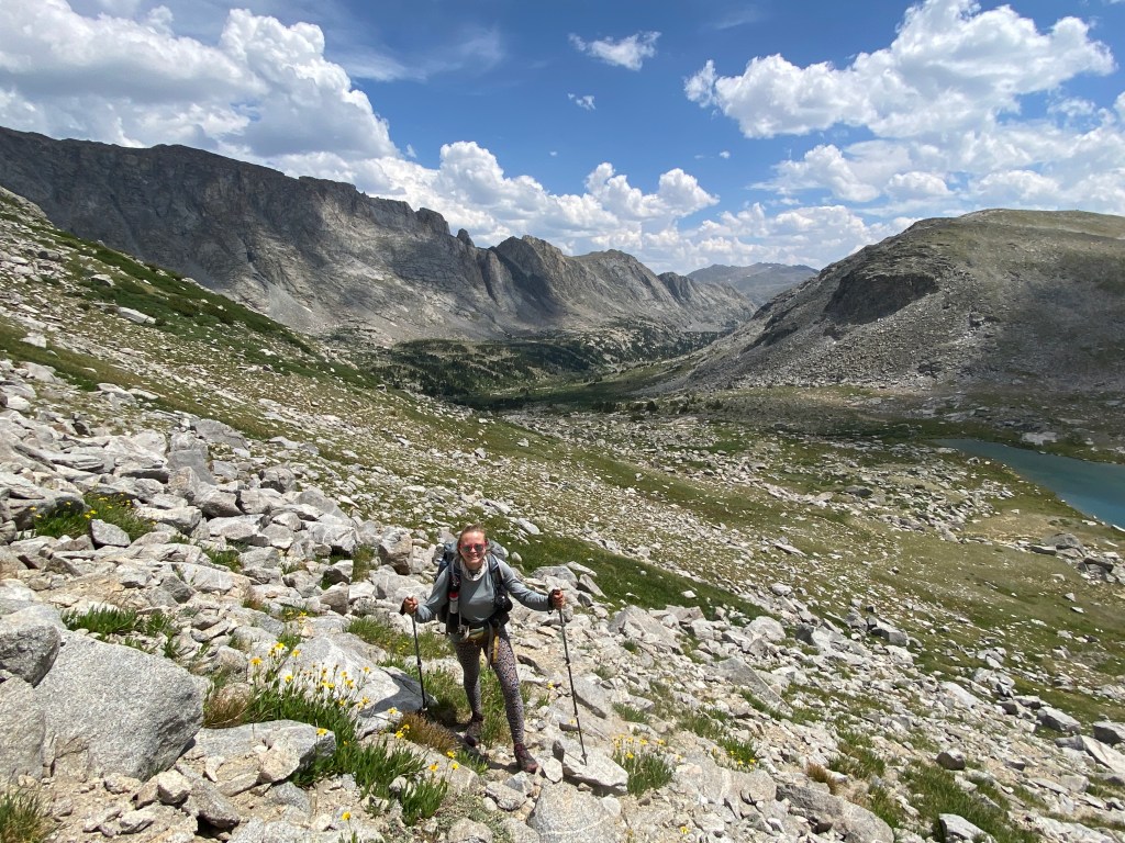 When we crossed the dam 12 pack broke a trekking pole which was absolutely tragic. This was such a difficult section and we were carrying the heaviest packs of the whole trip. Almost immediately after I realized he was missing a croc. What a bad day, especially on a hard day. When we finally finished the crazy bushwhack through blown down trees back to the trail, it wasn’t much better. It took over a mile before we could see a trail regularly again. We walked along a beautiful valley with lots of colorful wildflowers and flowing water before going up our first pass.