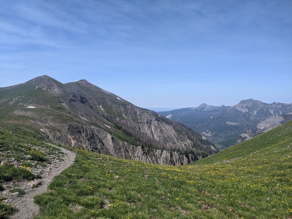 We started the morning by contouring around some mountains through beautiful and slightly rocky alpine meadow terrain. There was one small patch of snow we had to cross that was slightly sketchy but it was only about 15-30 feet across so it wasn’t bad. We passed a couple other CDT hikers going Northbound including an older lady named Force Ninja, a couple called the Noodle Heads, and Pro. For most of the day we would do a big climb up to the top of a pass, contour down and around a valley before going up another pass on repeat. The mountains were absolutely incredible and it’s hard to capture their beauty in words, photographs, or video.