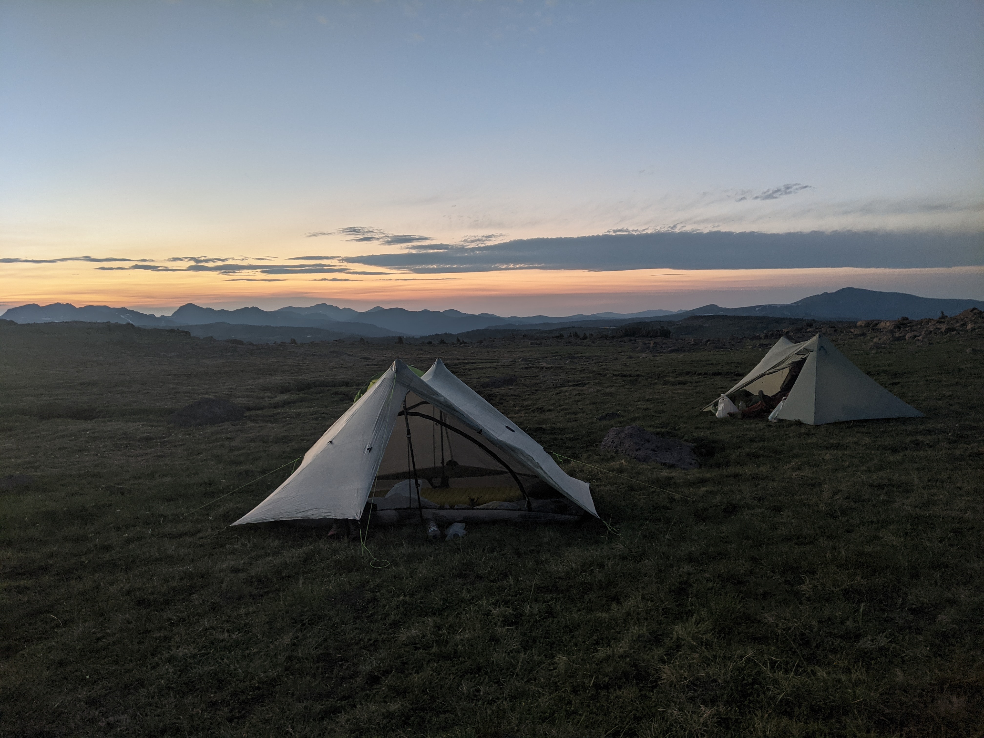 Near the end of the day we took a break at Blue Lake. It was a large alpine lake that was truly very blue. We could see brook trout swimming around the lake clear as day. 12 pack is a fly fisherman but he didn’t have a rod with him. He attempted to catch a fish with his trekking pole, a line made out of dental floss and a fly he picked up in Pagosa springs. The fish came up to bite the fly but realized it was attached to a line because the dental floss was so white. It quickly swam away. After an hour or so of enjoying the lake, we did a gentle climb up to camp. We passed by many more much smaller alpine lakes along the way. We arrived at camp around 7:30pm. I enjoyed a great sunset and company from my hiking companions. I am glad to almost be done with Colorado but I’m enjoying this one last night in the San Juans!
