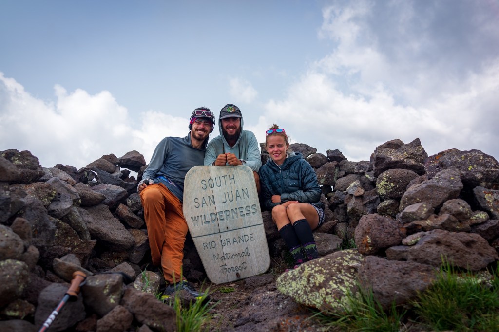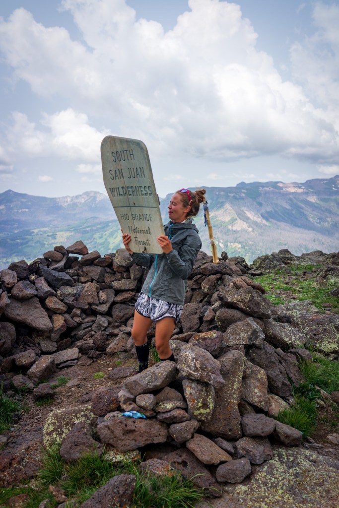 There was hardly any elevation gain at all today. Knowing that I had to climb less than 3k feet over 21 mile felt so relaxing. In fact it was so relaxing that I didn’t want to do any climbing at all just because I knew we were so close to being done hiking for a while. We dropped down in to a valley by Dipping Lake and then climbed another plateau. Once we got to the edge of the Plateau there was a beautiful view of the San Juan’s. I could see a waterfall gushing down a cliff side in the distance. There was a rock bicycle with a sign for the San Juan Wilderness so we all took turn getting pictures with it and hung out for a break. There were some cute marmots hanging out around us as well. The clouds started to collect and turn dark. I could tell it was going to storm and I wanted to get off the exposed part before that happened. I walked across a field and hail started to slowly fall from the sky here and there. It was probably the biggest hail I have ever seen. I stopped to pick a piece up and it was the size of a paint ball. Luckily none was hitting me yet but I could tell this storm was going to be a particularly bad one so I picked up my pace. I still hopped I’m the storm would end up blowing to the east of me but that’s not what happened.