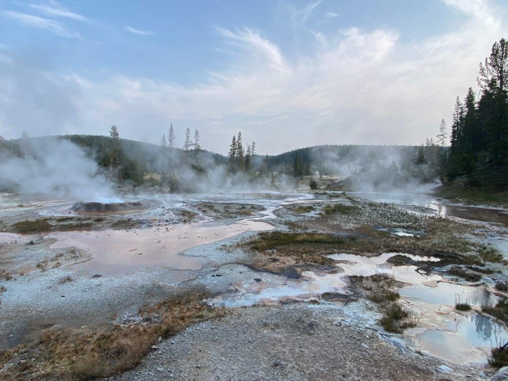 About five miles in to the day we crossed a very muddy bog. Luckily I had my pants rolled up because the mud was gooey and deep. I took some pictures of some cool looking lily pads and we could see some steam rising all around us from thermal vents. After the wet big we got to walk through Shoshone Geyser Basin which was so cool. There were small geysers and thermal pools everywhere. The ground was bubbling and hissing and the air smelled like sulfur. Occasionally I got to walk through some hot blasts of steam. One of the geysers was erupting quite a bit as we walked by and it was so cool because no one else was around. After the Geyser Basin I took a short break at a nice cold spring. I had some tuna and a chai tea. I’ve been having to force myself to eat all my tuna lately. It’s a trail food I get tired of eating very easily so I try to do it sparingly but I over did it recently. It also weighs a lot for not that many calories and the garbage from it stinks so I try to get rid of the garbage from it as fast as I can. The rest of the way to Old faithful village was through an evergreen forest like the rest of Yellowstone has been but it was very pretty. I saw two wolves at once and it was probably one of the coolest wildlife sightings I have ever seen. They crossed the trail in front of us and one of them was pure black and looked right at me as I made noises to scare them away from me. Almost a mile later I saw a massive bird that I found out was a sand crane from one of the rangers.