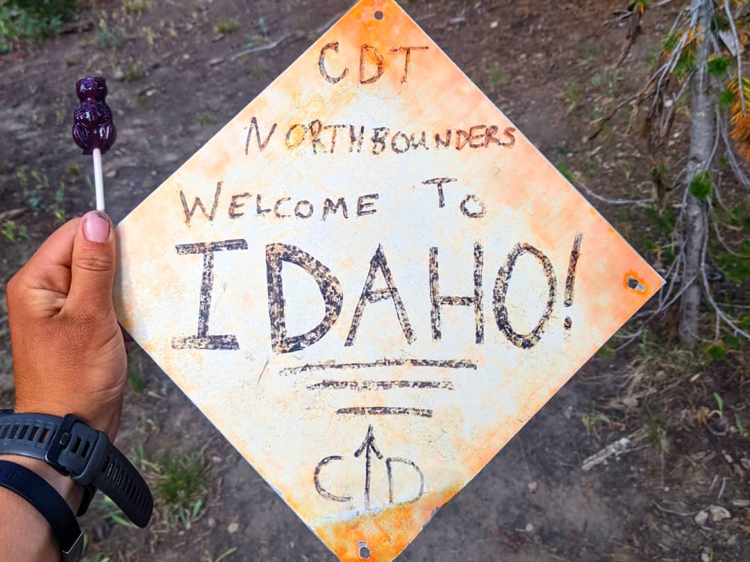 The day started out by hiking five miles over very flat terrain to the Idaho Border. I ate a huckleberry lollipop to celebrate and took some pictures. I took a long break and hung out at the border while the other hikers around us all crossed the border as well. After that I continued hiking about five more miles before I sat down for another break. I only got to take a 10 minute break because it started to rain hard and thunderstorm. Luckily this time I was under tree cover during the storm. It was nice to be able to continue hiking without worrying about much. Eventually I got to a sandy gravel road that I would walk on the rest of the day all the way to camp. I didn’t stop walking for quite a long time because it kept raining. I knew if I stopped I would just get cold. I miss the shelters on the AT where I could take out my sleeping bag during a rain storm and stay warm and dry during a break. On the CDT there is no where to hide when it rains unless you get really lucky. My feet were hurting and I couldn’t wait for the sun to come out. Eventually it did and I took a break and stretched for 30 minutes!