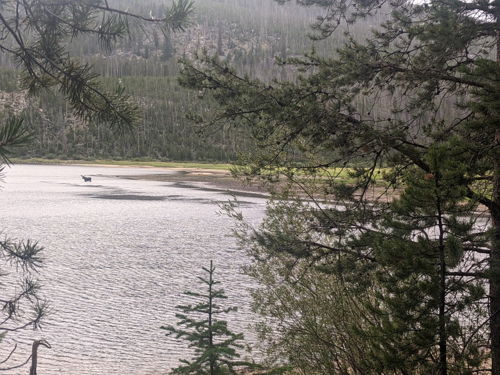 At the campground we ran into Exxon. We all hiked the 6 mile trail back to the CDT together. The wind was blowing hard and it was raining a little bit as we gained the elevation back up to the continental divide. On the way we saw a moose in the lake and it was so cool! After we got back to the red line it was 3:30 and we all took a really long break together. The weather wasn’t looking great and it was getting cold so we hiked two more miles before setting up camp even though it was really early. 12 pack and I’s only goal for the day was to get back on trail which we already accomplished. We set up our tents and cooked dinner away from camp. I had a breakfast skillet mountain house for dinner which was so yummy on a cold and foggy day! I loved where we got to camp tonight. The forest was beautiful and my tent was surrounded by huckleberry bushes. It was nice to hang out with Exxon too who is super nice! He is taking a different route to the border than us and trying to finish as the beginning of September so it’s very unlikely we see him again. I also forgot to mention that we are now in the Anaconda Pintler mountain range now!