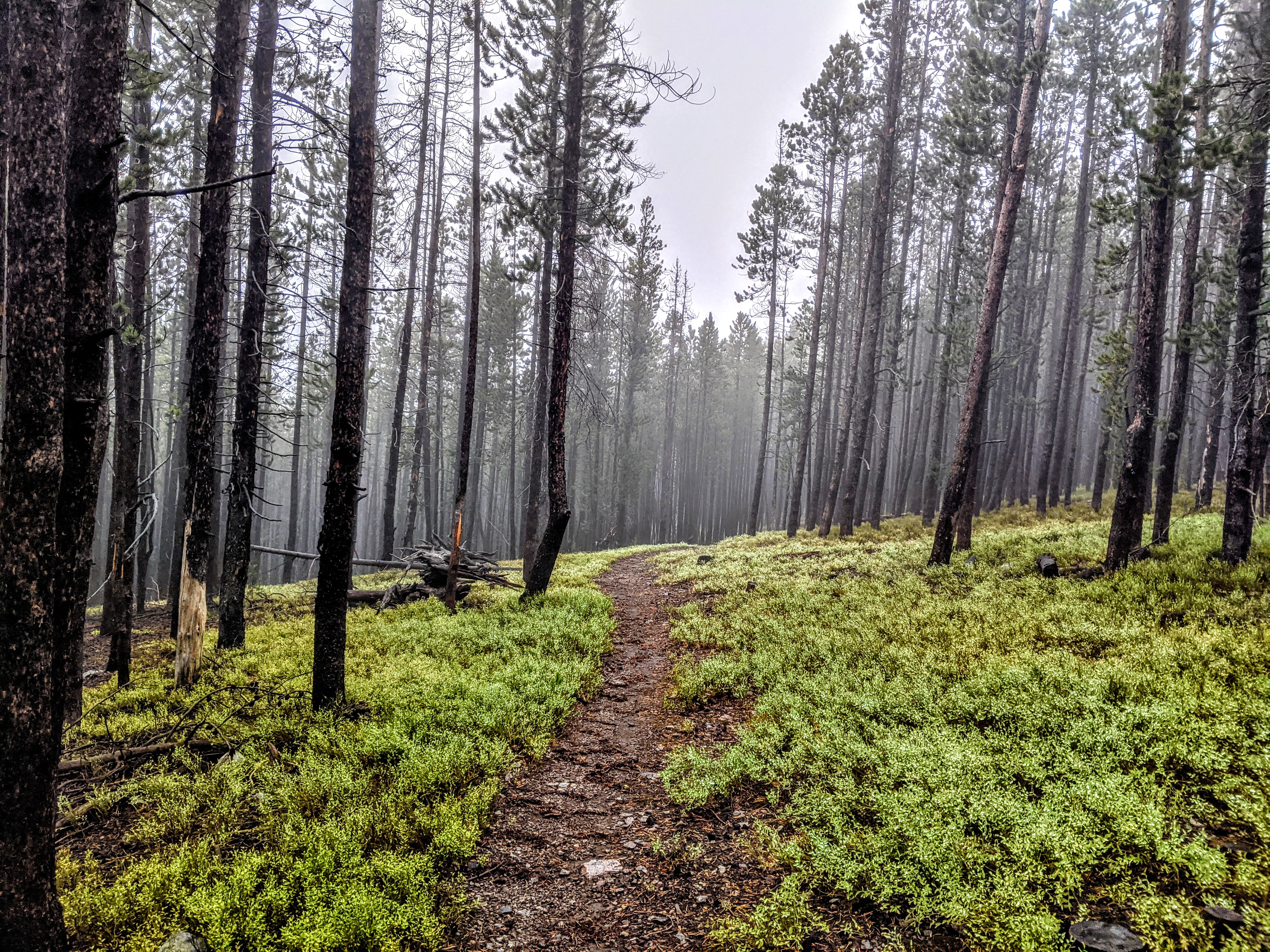 I left camp in my sleeping clothes and rain gear over top. I never ever hike in the clothes I sleep in if there is a chance that they will get wet. Today I was so cold I decided to take a risk. There was no way I was stripping down to put on my other clothes. The morning started out by walking through a sopping wet cow pasture and following posts with CDT signs on them. It was so foggy I couldn’t see the view at all. There was a large electrical wire I had to pass under that was buzzing extremely loud. It gave me a lot of anxiety and I realized that the trauma from all the close calls with lightning in Colorado still hasn’t left me. Any time there is a threatening looking cloud I feel like my body goes into the flight response. I have started to have internal dialogue with myself about how not every dark grey cloud wants to kill me and that eventually I’ll be living in civilization again with a place to hide when the weather turns dangerous. Some day I will no longer be running for tree line when the lightning strikes nearby. The rainy day and the buzz of electricity sent my heart rate sky rocketing this morning. The anxiety left after I was about a mile past the stupid buzzing wire.