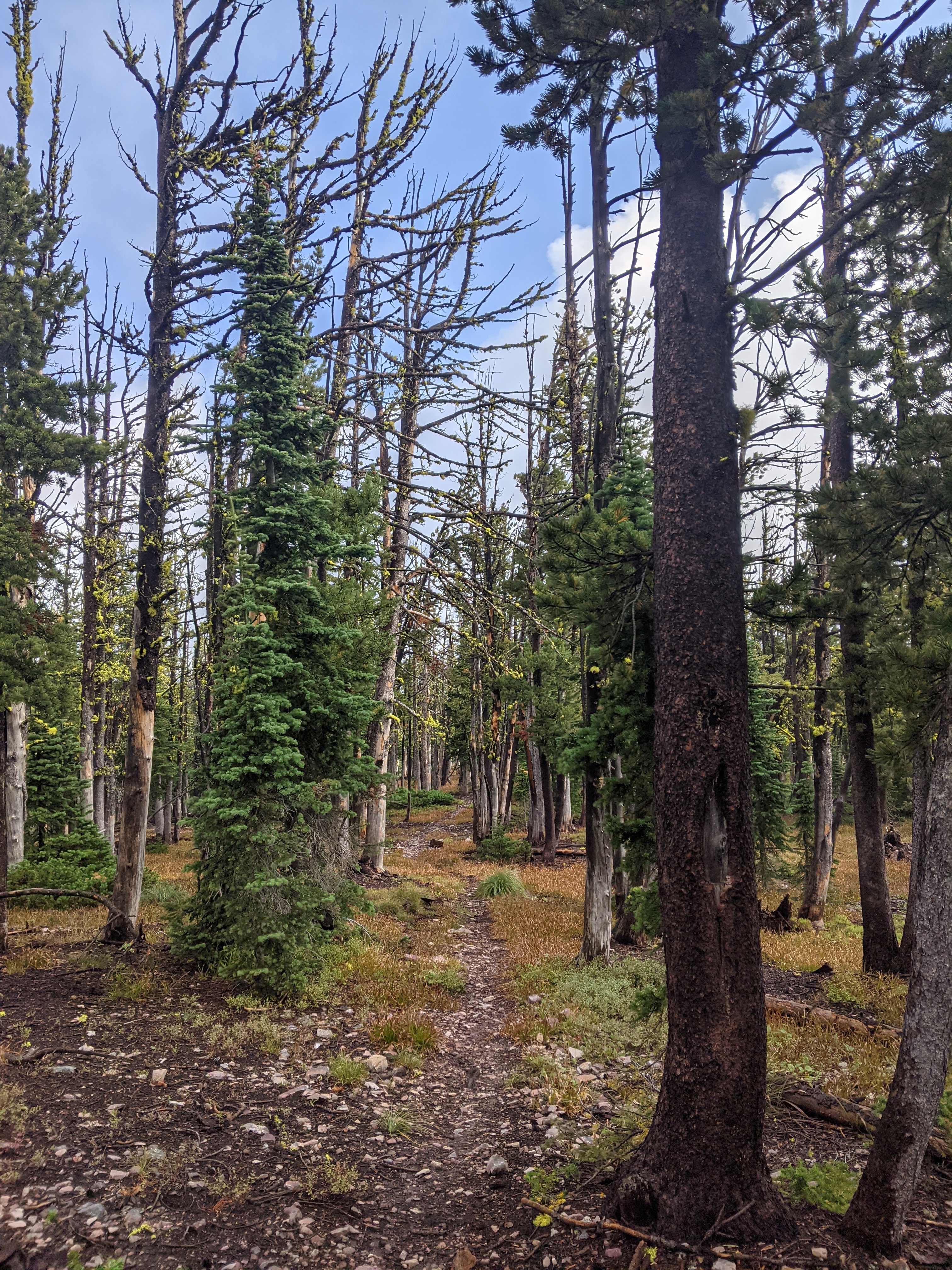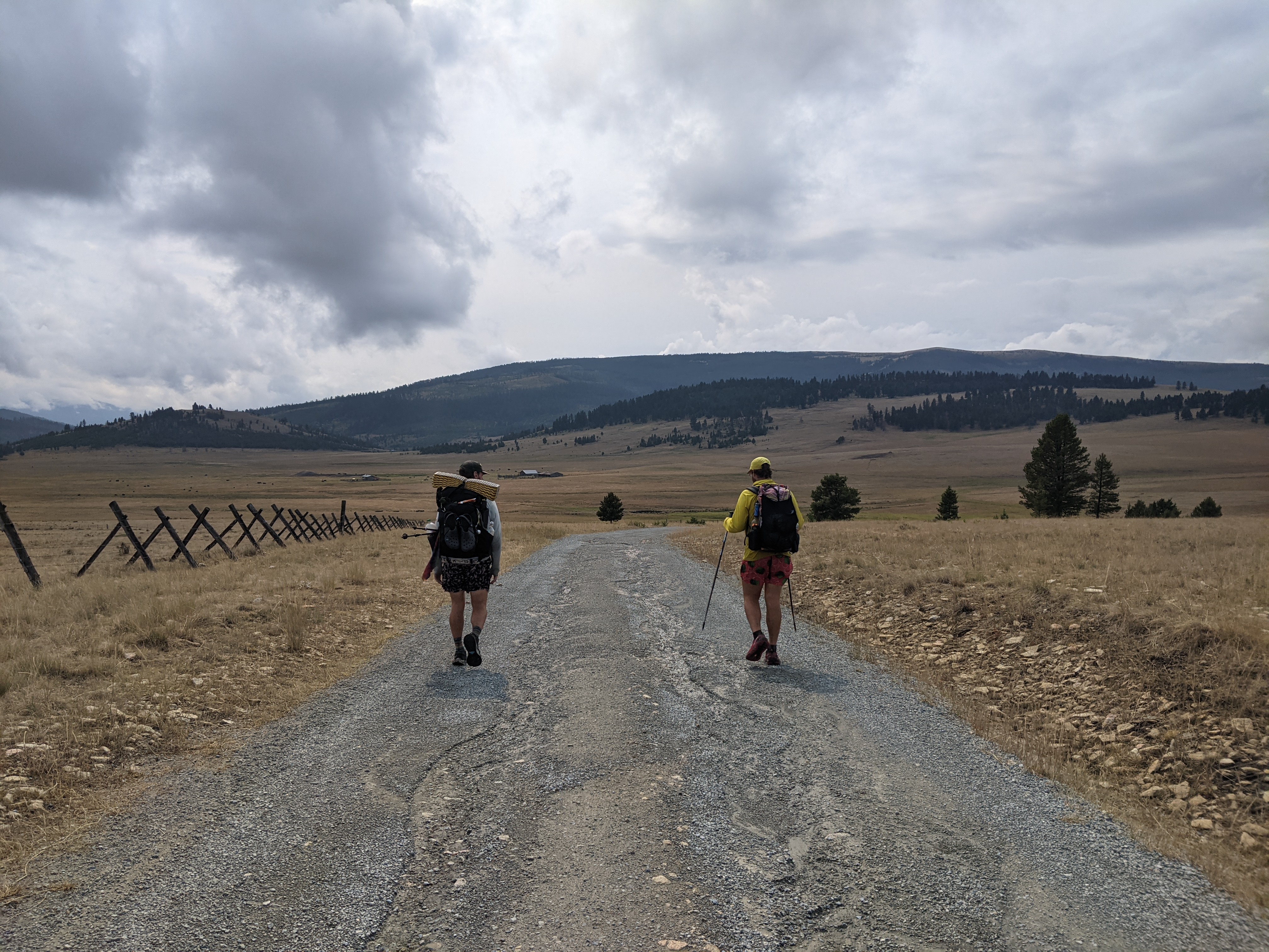 We got dropped off at the pass around noon. The day started out by walking on some dirt roads. It was sunny although the weather predicted storms. The prediction quickly came true. Right as we hit an actual trail the sky was looking very dark and it started thundering. Lightning and rain came just as the trail dipped into some trees. It was a big and scary storm but I could tell it was moving fast so I didn’t want to set up my tent. We were also surrounded by lots and lots of trees so I felt safe. I was right, the storm blew over in less than an hour and it stopped raining. It was perfect timing because we entered a wide open field again. The day ended with lots of road walking as well. I hiked around Melon and 12 pack today but my legs move a little slower so I was dragging behind at a couple spots. We stopped to make dinner on the side of the road. A man hiking south passed us and stopped to chat. He is hiking the great western loop and seems like he is on great pace to finish it before getting caught in crazy snow. He has to hike about 50 miles a day for a bit and I think he can do it. I can only imagine how sore his feet must get.