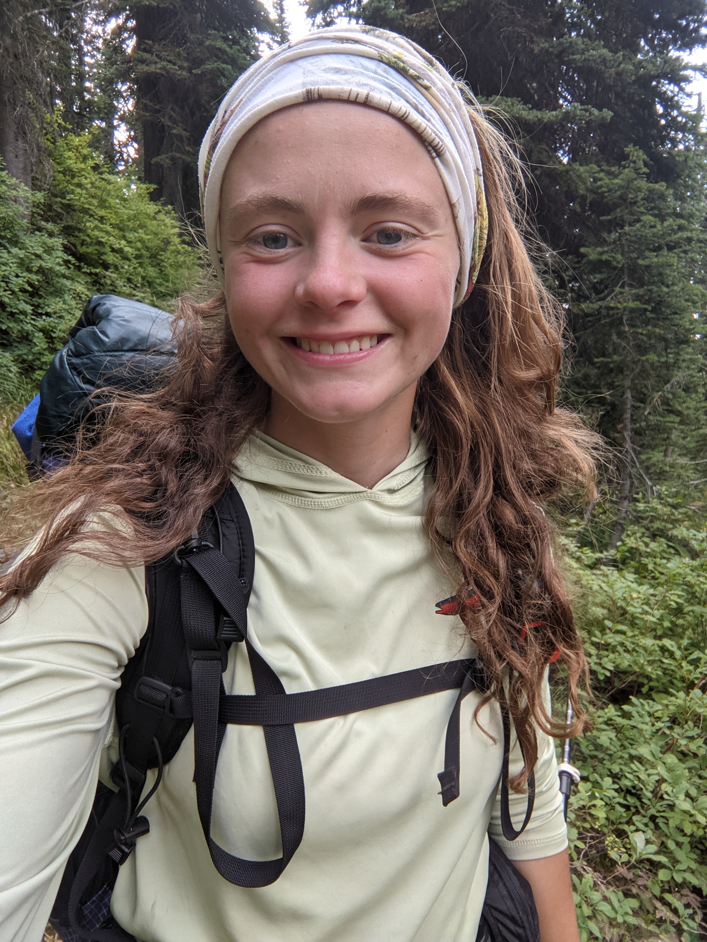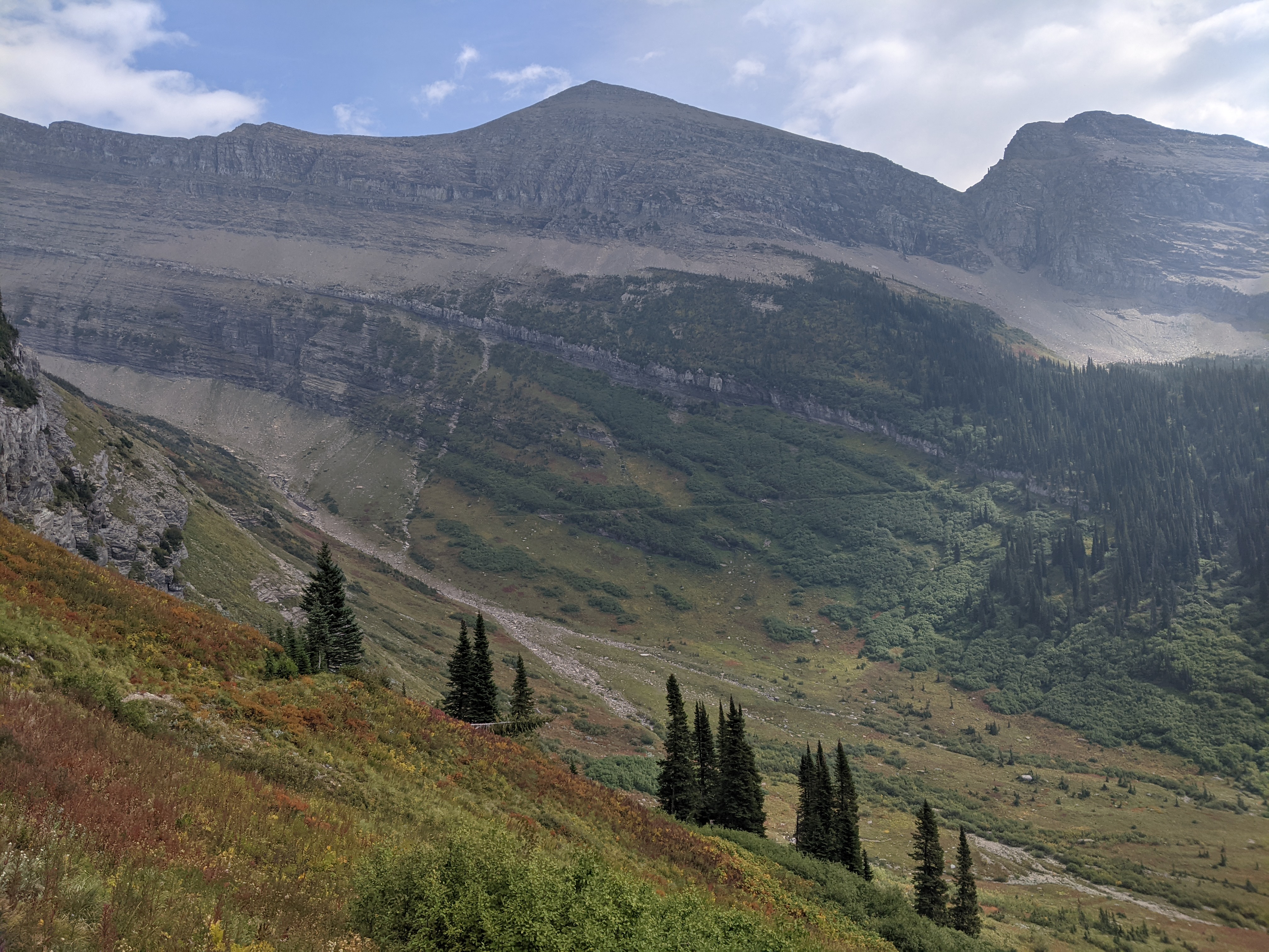Once back on the CDT, I hiked alone most of the way to camp. I could see legs in front of me but I was going my own pace now. No more running to keep up with longer legs. The trail hugged the side of the mountain again and circled around some valleys. I was on the lookout for grizzlies. The air was very smoky and most of the mountains in the distance were obscured by smoke but their outlines were still dramatic and pretty. I passed a couple hikers going the opposite direction and they let me know that a grizzly ʕ·ᴥ·ʔ was spotted ahead. I was a bit Nervous but I didn’t end up seeing it luckily!