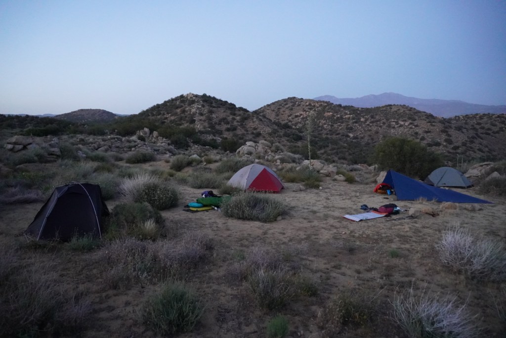 It was 6am when I finally walked out of camp after packing up all my things. I stopped to fill up all my water bottles at a creek three miles from camp because I wasn’t planning on getting any more water until Mike’s Place about 12 miles later. At mile five I took an hour break to do all my morning chores I didn’t want to do at camp. I stretched, cleaned the dirt off my feet, taped my toes, put on my calf compression sleeve and gaiters, ate breakfast, looked at the map for the day, and wrote my blog I didn’t write yesterday. It was hot today and my goal was to get to Mike’s place at mile 15 by noon. The trail curved through the mountainous desert landscape and I listened to a playlist from Spotify. When I got to Mike’s place I immediately laid out my mat and all my belongings for a long break in the shade.