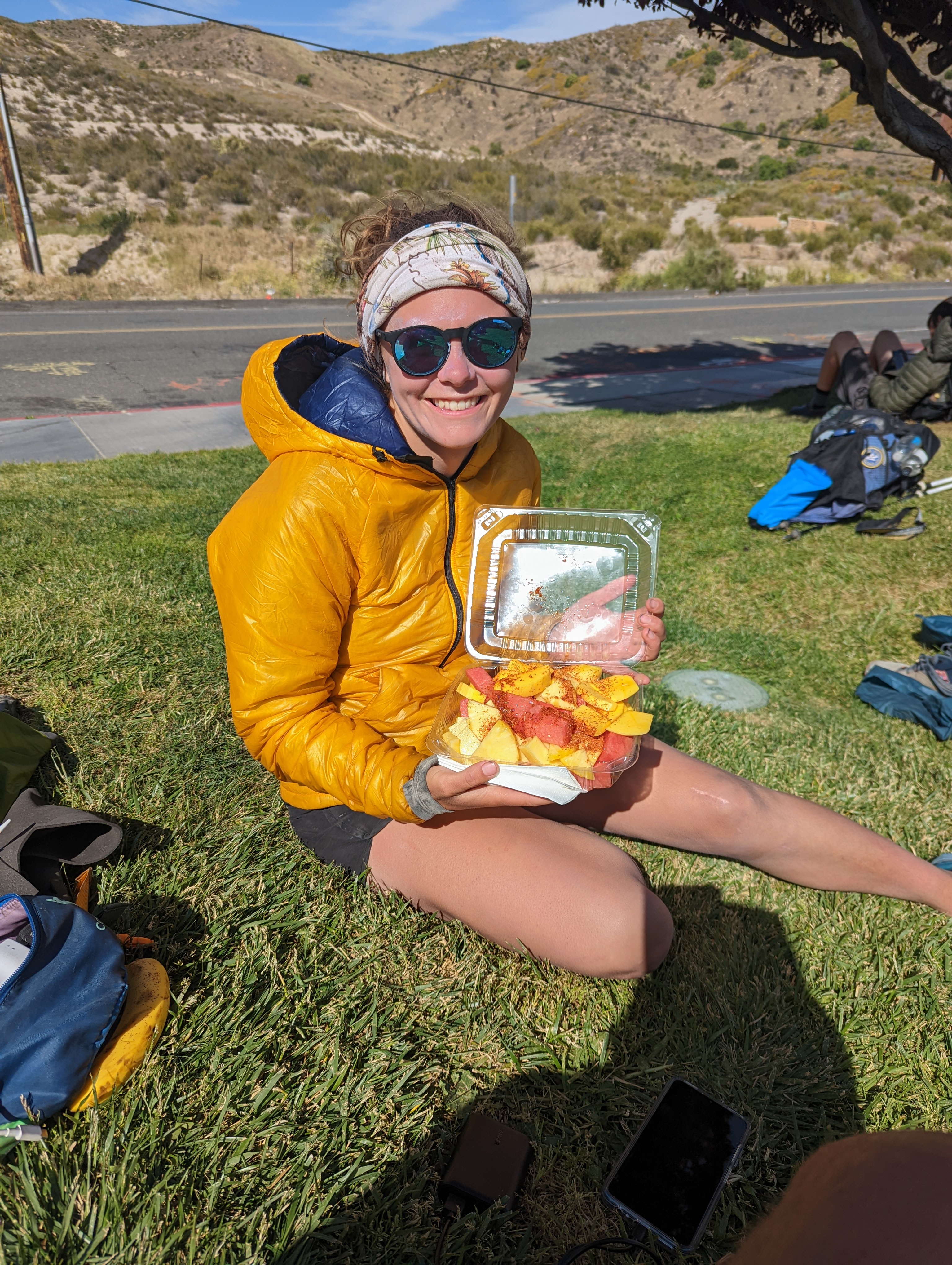 When I walked up to Mc Donald’s there was a large crowd of hikers outside waiting for food. I was glad I had already placed my order. Here I ran into Gaurdian who hiked a few hundred miles with my sister when she did some of the AT in 2019. It was good to see him! I know Emma has been waiting for us to run into each other so we took a picture and sent it to her. I hung out with Gaurdian and the other hikers in a grassy spot outside. My McDonald’s tasted so good! At Mc Donald’s I also ran into Lost Boy who we met in Big Bear and have been wondering where he got off to. He ended up hanging out with me for the rest of the day. After Mc Donald’s I got a large fruit container with Mango, Water Melon, Pineapple and Tajin from a little fruit stand in front of the gas station next door. It was delicious. I iced my shins with my left over drink ice and charged up my devices while I waited for the others to show up. It was almost two hours later before the first one did. I was surprised they ended up getting out of camp significantly later than me. I called my friend Carly/ Trail Diva while I was at Mc Donald’s. I found out she was only one day ahead of me. I looked in my food bag and realized I wouldn’t have to buy much from the gas station next door to skip the next town and catch up to her. I was excited! When I told the others they were all sad about me leaving. I was too but I really want to see my friend and felt like I could catch up to her soon.