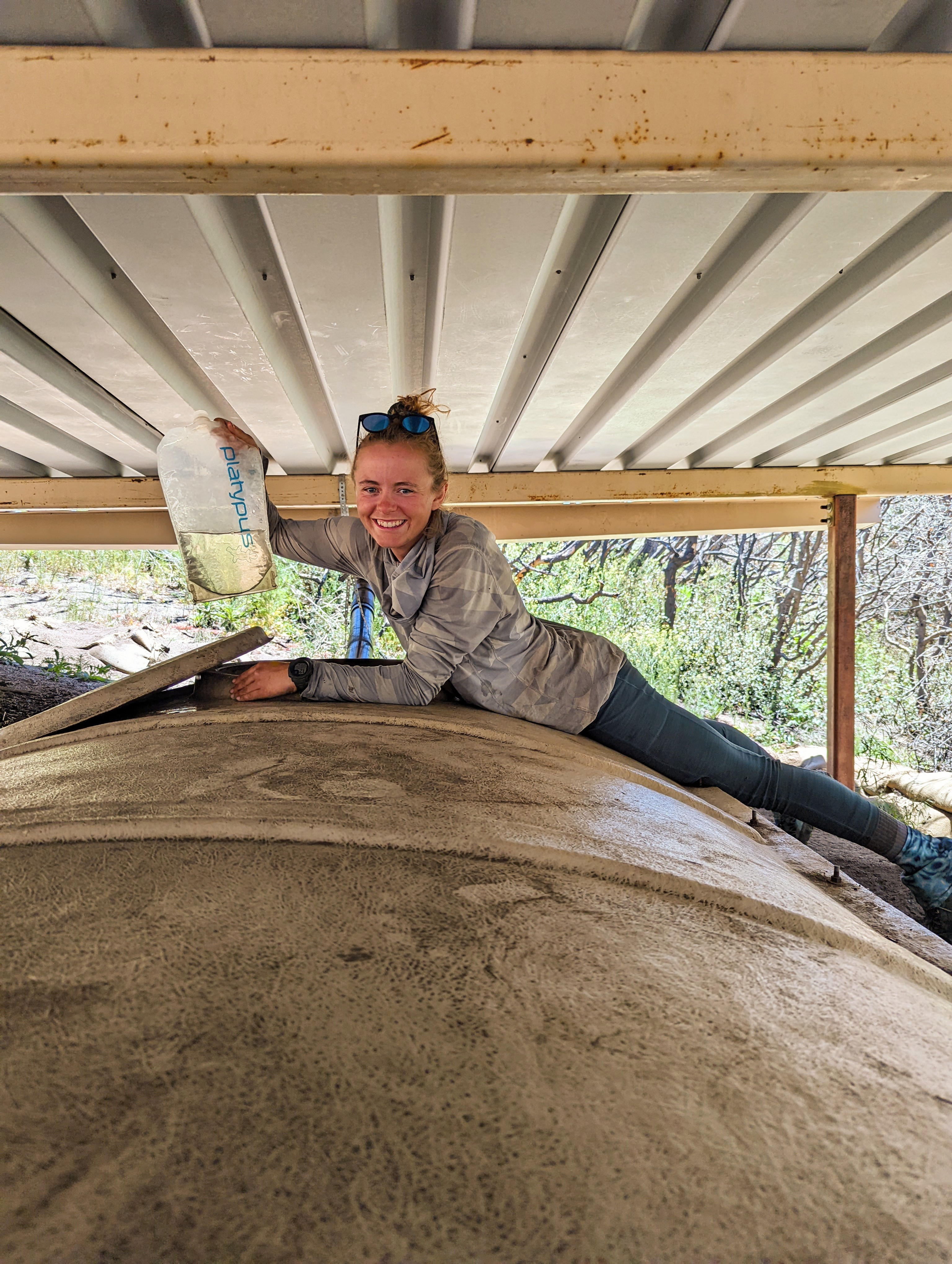After the 500 mile mark I hiked to the next water source which was a cistern that collected rain water. I had to crawl up underneath it and spin a circular lid off the top of it. I reached my arm down far to reach the dirty water that I scooped out with my soft water bag. When I pulled it up to look at it, it wasn’t bad. I continued to hang out with both Ashley and Bitter Goat there in the shade. I felt like a troll under a bridge. It was noon when I walked a few more miles to another shady break spot. The trail was very easy and cruisey. Once again I took a multi hour long break and stretched all my muscles. I wanted to push into Hiker Town tonight because I still had so much time and it wasn’t much farther. I knew it would be a bad idea because I was trying to take it easy and it would be over 20 miles. My shin started hurting the last mile before the last marked campsite before town. I decided that was my sign to stop hiking for the day so I pulled over and set up camp in a wind protected area of bushes and trees near Ashley. It was only 5pm. I was glad for all the time at camp to relax and rest up. I was worried why my shin started bugging me again but I’ll take two days mostly pain free! I planned to wake up early and hike the seven remaining miles to Hiker Town in early morning cool air.