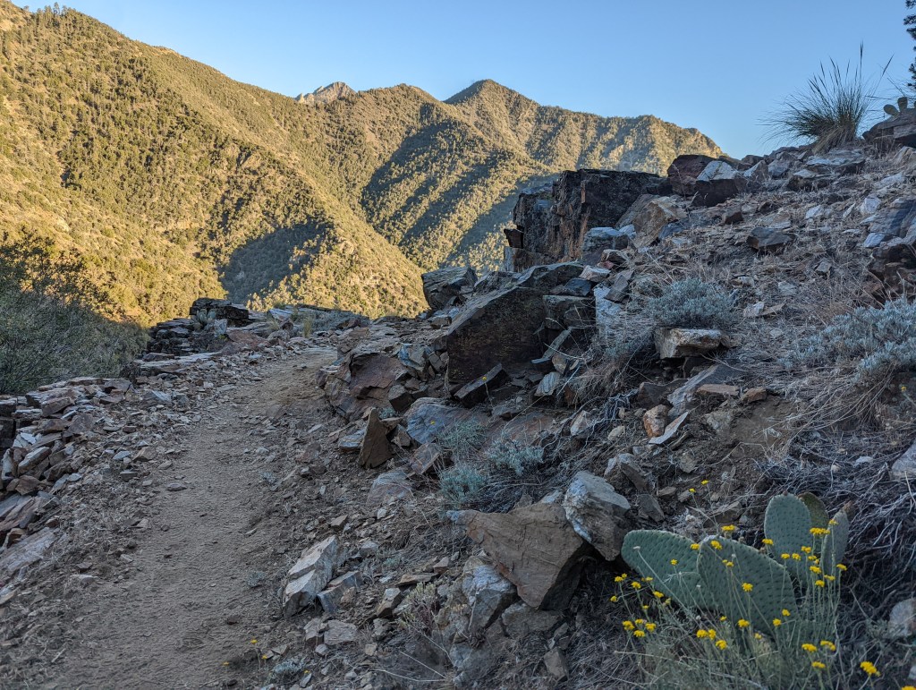 I hiked pretty quickly all the way downhill to the spring in the heat of the day. I passed lots of Joshua Trees and I wondered if they would be the last ones I would see on this trail. I left the break spot before everyone else and flew to the next water source. I was still feeling amazing. The source was a trickling spring. I used my empty talenti ice cream container to collect water to put into my pouch to filter it. In about a month I would guess this source to be dry. Here I ate my dinner and got ready for a final push to camp.