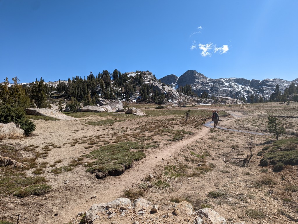 Today reminded me so much of Montana and Maine. I absolutely loved it. Most of the time the trail was under conifer trees and there were lots of granite rocks and mud. I got to hike with Pop Rocks quite a bit today since he goes closer to my pace. We went up and over Benson Pass which was really easy but I could feel my fatigue as I went up it. At the top we waited for Tiger Lily. After that we only had 6.5 miles of mostly downhill until camp. We camped on the sandy beach of Bensen Lake. It was one of my favorite campsites of the whole trip so far. It was a cold night so I got into my sleeping bag and tent pretty early tonight.
