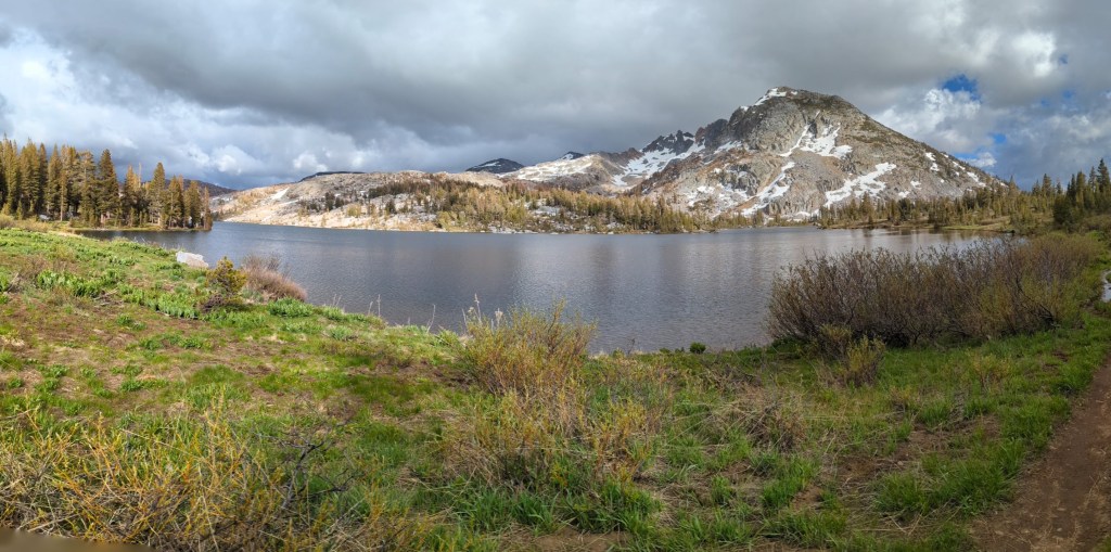 At 3pm I start hiking the last part of my day as swiftly as I can. I wasted so much time sitting around this AM. I get an in reach message from Pop Rocks saying they won’t make it to the planned campsite at 24 miles today. I am bummed I won’t see my friends and annoyed I waited around for so long, but I’m glad that I can now push on even farther tonight if I want to. The climb up Dorothy Pass is the easiest one yet. The trail went slightly uphill for 10 miles before cresting over the pass. If it weren’t for it being called a pass and the scenery changing on the other side I would have no idea it was a pass. The south side was a big muddy meadow. I was careful with each step to keep my feet dry. I pretended I was in Maine. The sky was dark and cloudy. Sometimes very little amounts of snow pelted me. I was waiting for it to start storming. It never did. Dorothy Lake was pretty in the moody lighting with bits of sunshine hitting the peak behind it.