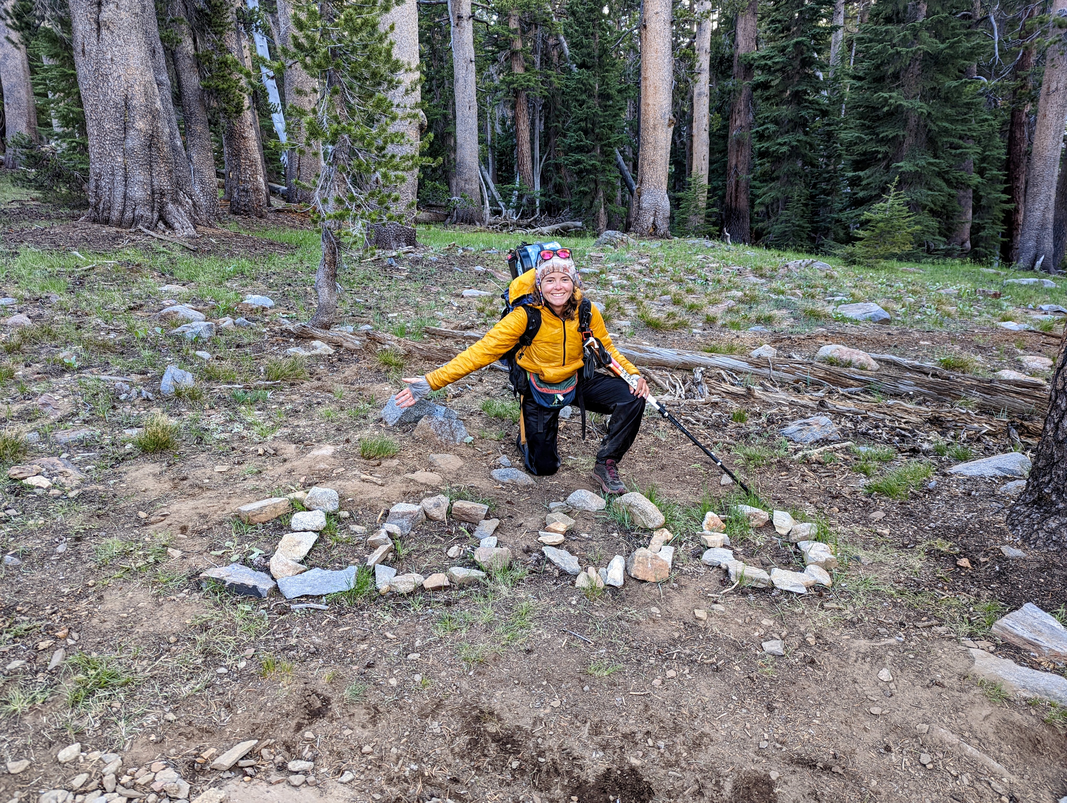I go down the other side of Seavy Pass taking my time on the downhill. I am hiking so slow today because I am tired. The valley at the bottom is gorgeous. I think the Yosemite section of the PCT is my favorite. The granite rocks and all the pines remind me of Montana and New England. At the bottom I cross a large flowing creek on a massive log upstream. On the other side I take another snack break and de layer my warm puffy since I’m about to start sweating on the uphill. There are lots of ups and downs today. I kind of enjoy it. It reminds me of the AT. I cross another valley and another large creek. I start looking for dry crossing options on this one but find none. I see a girl sitting on the other side and ask her how she crossed. She told me she went straight thru it. The bottom looks sandy and soft with pebbles so I take my shoes off for this one. I am determined to keep my feet dry today. On the other side I take a break and get to know this girl as “Bone Broth” we both eat lots of snacks and talk about how we don’t know where our hiking friends are. Another up and downhill later, I find myself at Wilma Lake. I see a group of hikers sitting in the sun. Ziploc who I met at Tuolumne calls me over. I take a break with all the other hikers. I pull out my sleeping bag to dry it in the sun and also use it to keep me warm. I get cozy because I plan on waiting here for more than an hour for Pop Rocks and Tiger Lily. In the meantime I catch up on writing my blog so I have less work to do at Kennedy Meadows. After an hour and a half they still don’t show. I determine it’s late enough to leave and continue on. I knew they might now make the miles today and I saw this as a sign .