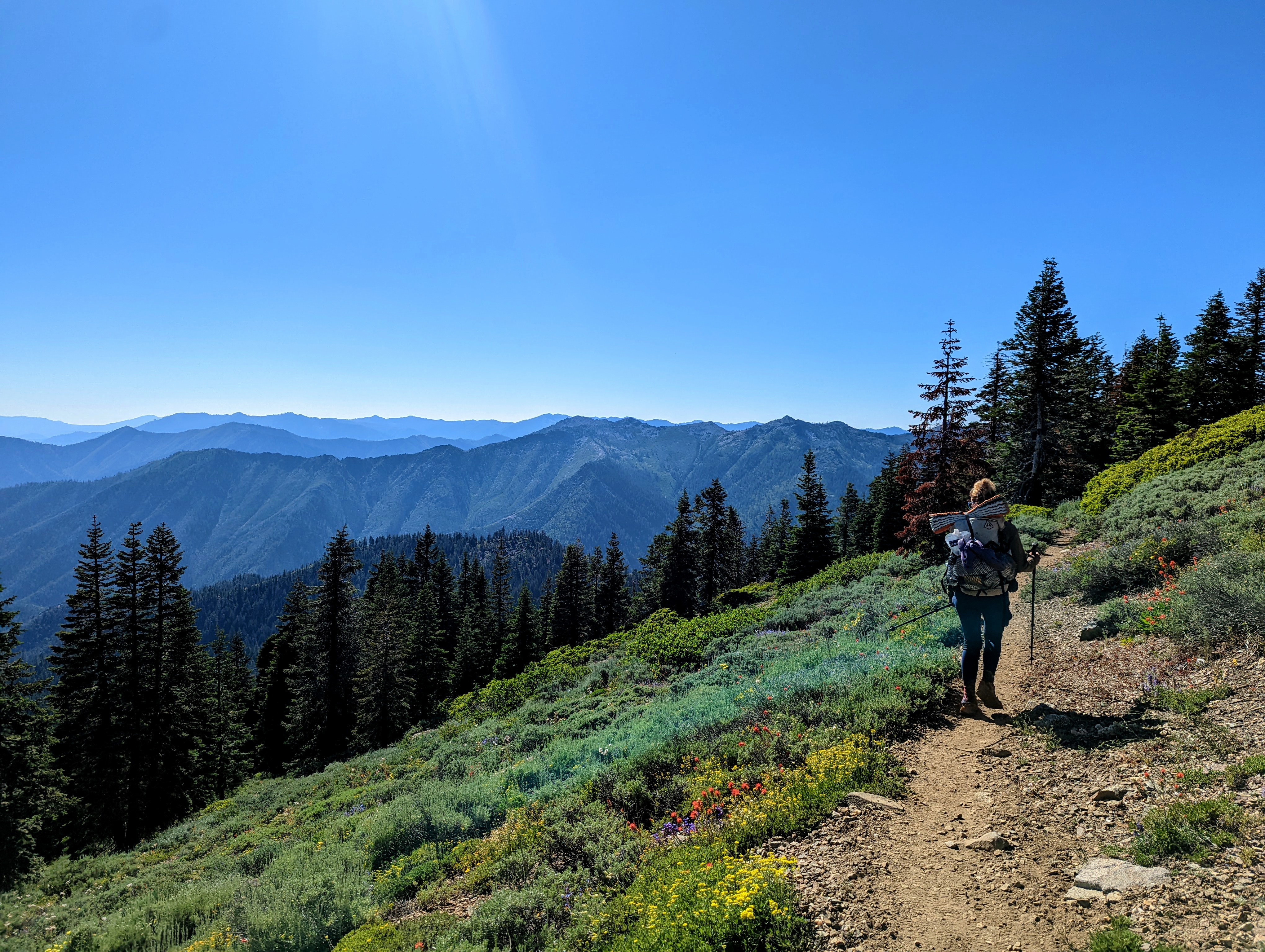 At the water source, I made a butterscotch pudding and drenched all my clothes to make them cool because it was already getting hot. Trail Diva caught up to me here but I hiked on. From the water source it was mostly uphill and exposed on the side of a mountain. It just kept getting hotter and I was glad I had music to distract me. I stopped and chatted to a SOBO for a few minutes. The SOBOS had a rough start this year. There is still a significant amount of snow in Washington so anyone who started early ended up skipping Washington or doing a flip flop hike. Complicated logistics from day one. I was thankful we are hiking North and hope the snow melts off by the time I get there! They had a higher than average snow year in Washington this year.