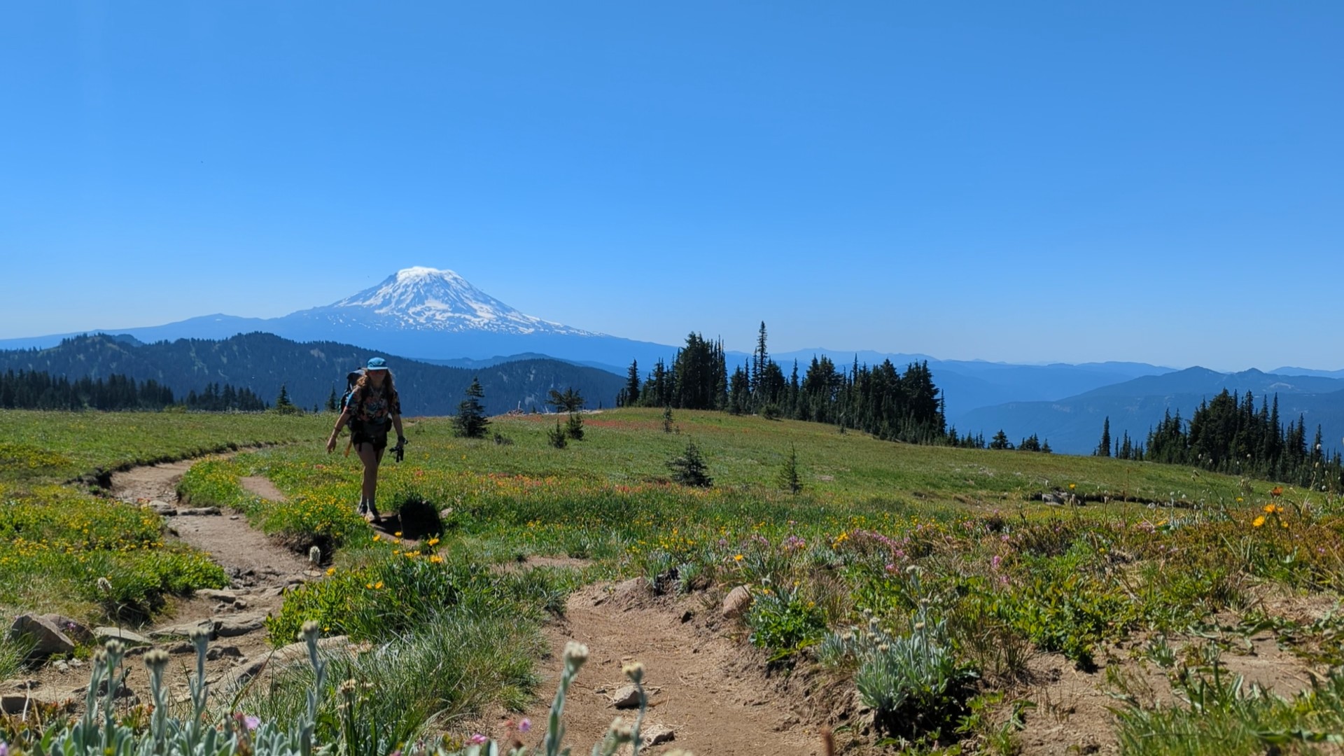 Cispus Pass was gorgeous. The peaks surrounding it had patches of snow and there was green grass, wildflowers, and waterfalls everywhere. I took an hour and a half break at the top. I got out my sleeping bag to dry it and took a cozy nap in the warm sun. I wished my weiner dogs were with me. I also tried to super glue my sunglasses that I broke yesterday since I will be hiking through some snow today and didn’t want to be blinded. I did a poor job. I’ll definitely have to buy another pair in the next town. After an hour and a half I left the top because I had to go to the bathroom and there were no trees or places to dig a hole. I went quickly down hill into the next stunning valley. I crossed a few creeks, one of them I did over a snow bridge. I went really fast because I was scared to bust through the snow. There was also an incredible waterfall I wish I could have spent more time at. I continued on with views of Adams and Ranier. It was an incredible day. When I started going uphill again I felt so exhausted. The rest of Washington is going to be so hard for me. I feel like my body is just falling apart and wants me to be done so badly but I still have to go over 600 more miles! No breaks yet!