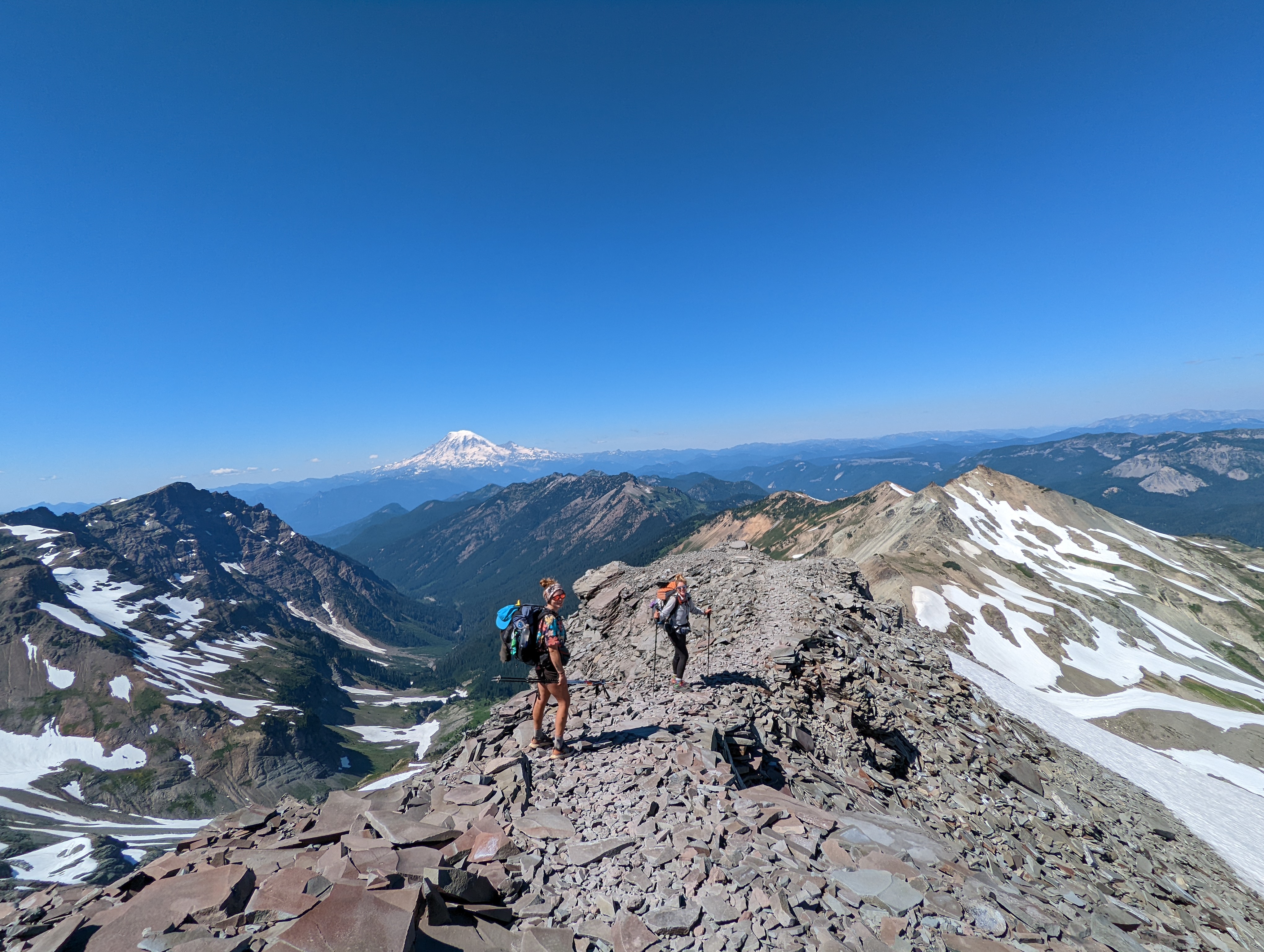 I took a break at the junction of Old Snowy peak and the PCT. It was a nice long break in the hot sun. The view was absolutely stunning and I was glad I got to sit there for so long before Diva and Trash Panda showed up. We all hiked the Alternate together up towards the peak. Trash Panda bagged it but I had no desire. It looked sketchy. I made a sign out of rocks in the snow to celebrate hiking 2000 miles on the PCT today! This is the third time I’ve gotten to hike over 2k miles on a singular trail. It’s a big number for sure and my body definitely feels it. I think I feel equally tired as every other time I’ve hit this milestone. After Old Snowy Peak, the trail went on a crazy Ridgeline. It was so cool but definitely made me nervous. Diva and I went slowly. I was following her and just kept getting more anxious because it felt never ending and I just wanted it to be over. There were crazy steep drop offs on either side of us and the footing was loose but stable enough that it was safe. It just took a long time to go two miles. Once we got off the ridge into a valley by a stream, I was so glad. This part reminded me a lot of Colorado and the Continental Divide.