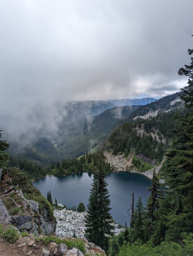Today everything was soaking wet when I woke up. Meadows usually produce a lot of condensation over night so I wasn’t surprised. I was also very cold for the first time in a long time this morning. I quickly packed up my things and started walking fast because I was so cold. The day started with a downhill and I stopped to eat breakfast at a gushing creek with clear water around five miles in to the day. Right after, I got a little lost in a bunch of blown down trees that covered the trail. I eventually found the trail again. At the bottom of the valley was a cascading creek. It was gushing full force and I walked up and down it looking for a place to cross. Not only did it look like I was going to get my feet wet but also there weren’t a lot of safe looking spots. After ten minutes of analysing the best decision, I jumped across as far as I could into water on a bunch of loose rocks. I was soaking wet but glad I didn’t twist my ankle. It was risky but there wasn’t really any other good choices. I kept going wondering if my friends were behind or ahead of me since I was lost off the trail for a minute and took so long to get across the creek. I took a bunch of breaks to wait on them but they never caught up. I kept going to the top of Piper Pass. It was really pretty as I made my way back down into the next valley. I had a great view of Surprise Mountain and all the lakes around it. The day was warming up but large clouds were still hanging low over the mountains. I thought it was pretty. Diva caught up to me when I was taking a snack break. She told me she fell into the creek I took forever to cross this morning. We hiked together almost the rest of day and found Midnight about 15 miles from camp. We all took a break together and dried out our wet tents and sleeping bags in the sun that finally decided to come out. 10 more miles to the road at Stevens Pass.