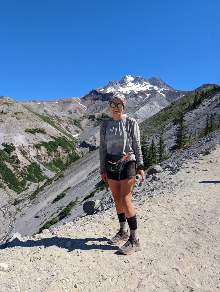 After our break, we continued on uphill. The PCT joined up with the Timberline trail, a 40 mile trail around Mount Hood. It was very popular and I passed so many backpackers on the loop. I’d love to come back and do it someday! The wildflowers in the area were so pretty and occasionally we got a glimpse of Mount Hood up close. It looks like most of the glaciers/ snow up there are melting. It also doesn’t seem to look like that intimidating of a peak but I’m sure it is. It is the Oregon High Point at 11,249 feet. The trail became sandy and difficult. I was not a happy camper when my feet, legs, and everything else was hurting. I just wanted to get to the lodge!