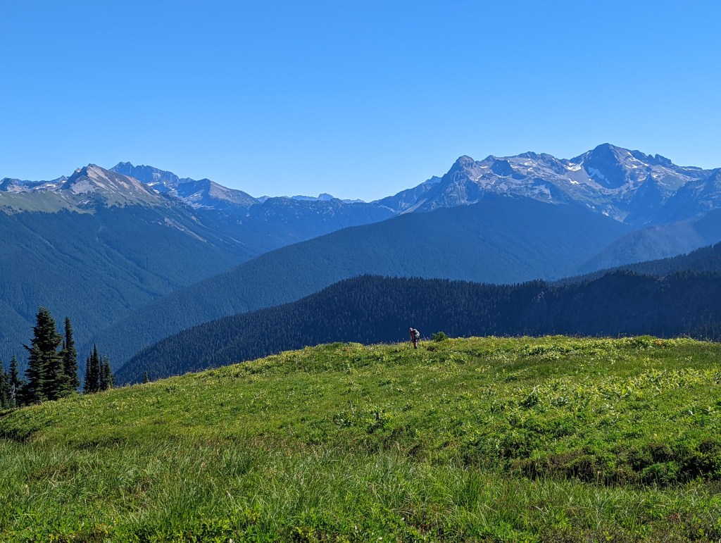 The first thing I did when I woke up this morning was make coffee. I usually don’t drink coffee because caffeine makes me feel nuts. I plan on drinking it everyday for the rest of the trail to give me the energy I haven’t been able to find for the past month. It was nice to have something to warm me up. I packed up my wet tent and hit the trail at 7:00 a.m. The day started with a steep descent with lots of switchbacks. As soon as I got down to a milk creek at the bottom of the valley, the trail went straight back up. The climb was steep and felt long. My quads were burning and I was so exhausted from climbing up and over so many fallen trees. It was a full body workout. I considered taking a break because I was mentally and physically so beat. It wasn’t even 9:00 a.m. yet! I took the opportunity to listen to music for the first time in ages to motivate myself up the climb. It was really nice. At the top, I took a long break in the sun to dry my tent out, eat second breakfast, and filter water. The view was absolutely stunning. I thought I could see Mount Baker covered in glaciers in the distance as I started to descend.