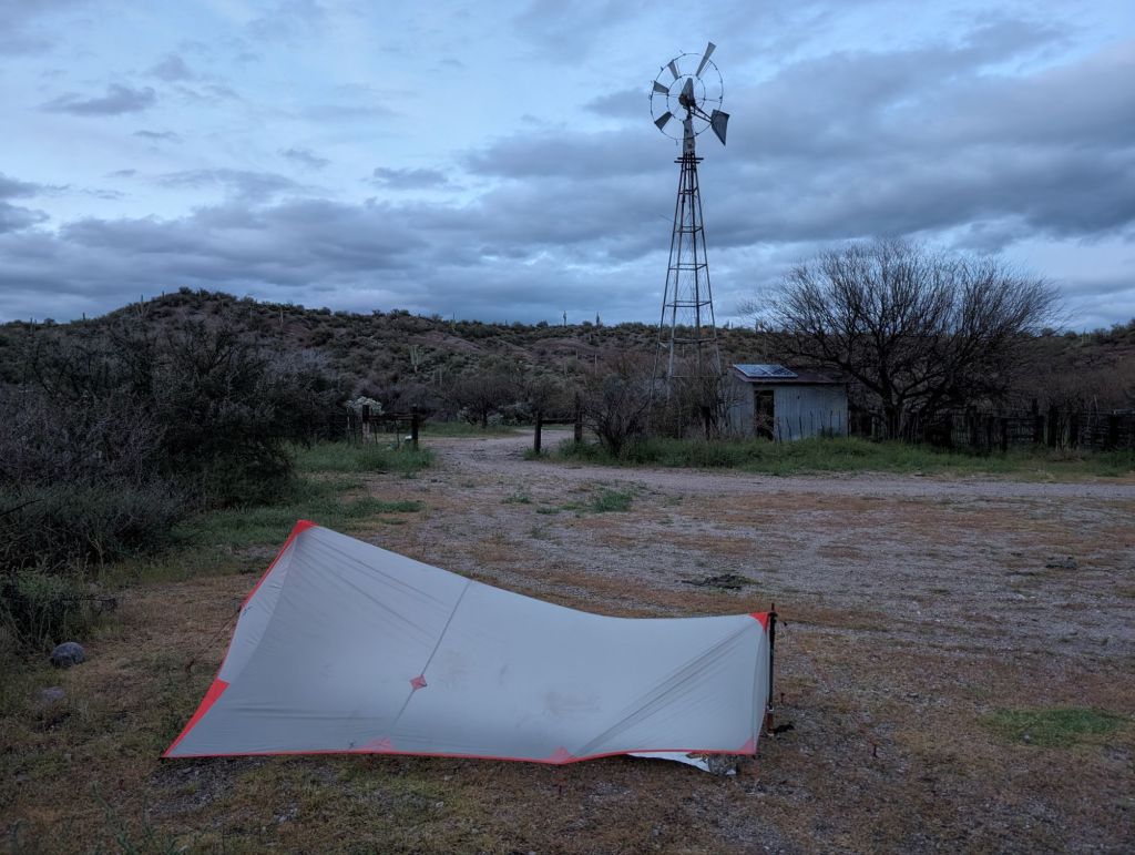The rain let up just as I got to the water source. Another really big tank. Although all the rain sucked at least it made the desert pretty. I was glad it stopped when I got there because I wanted to make dinner. I ended up setting up camp here because I didn’t feel like night hiking while wet. I figured I might get really cold and I should take advantage of the opportunity to set up my tarp and get in my sleeping bag while the sun was still up for a few more minutes and I had some body heat left from all the moving. I was glad I did. Christian set up camp about 100 yards from me. We didn’t talk much but it was nice to know someone else was camping nearby. Depending on how much it rains while I sleep tonight and how well I sleep, I might try to get up crazy early and make it to Kearney tomorrow but it’s still really far away. I’m really hoping for some sunshine.